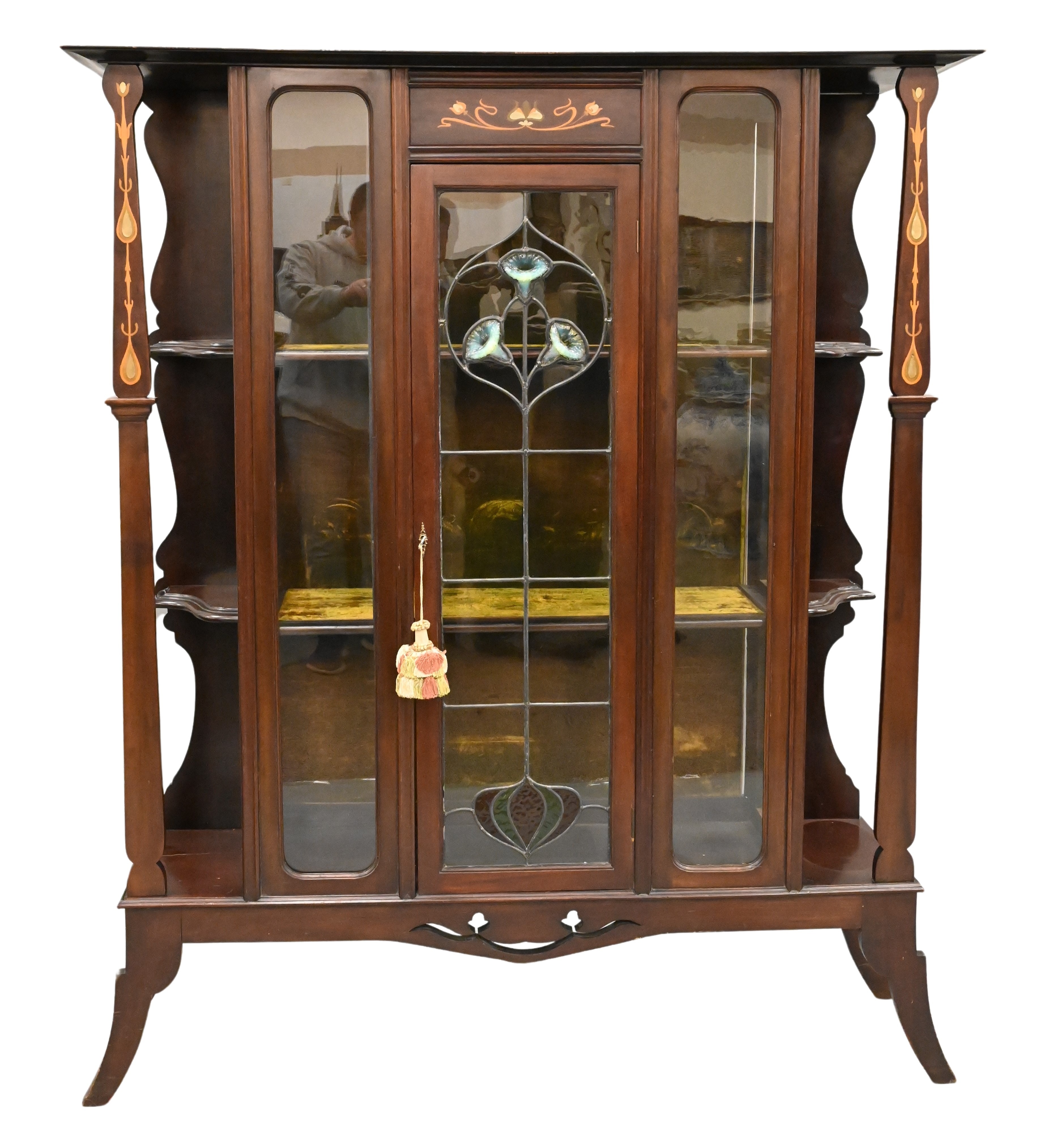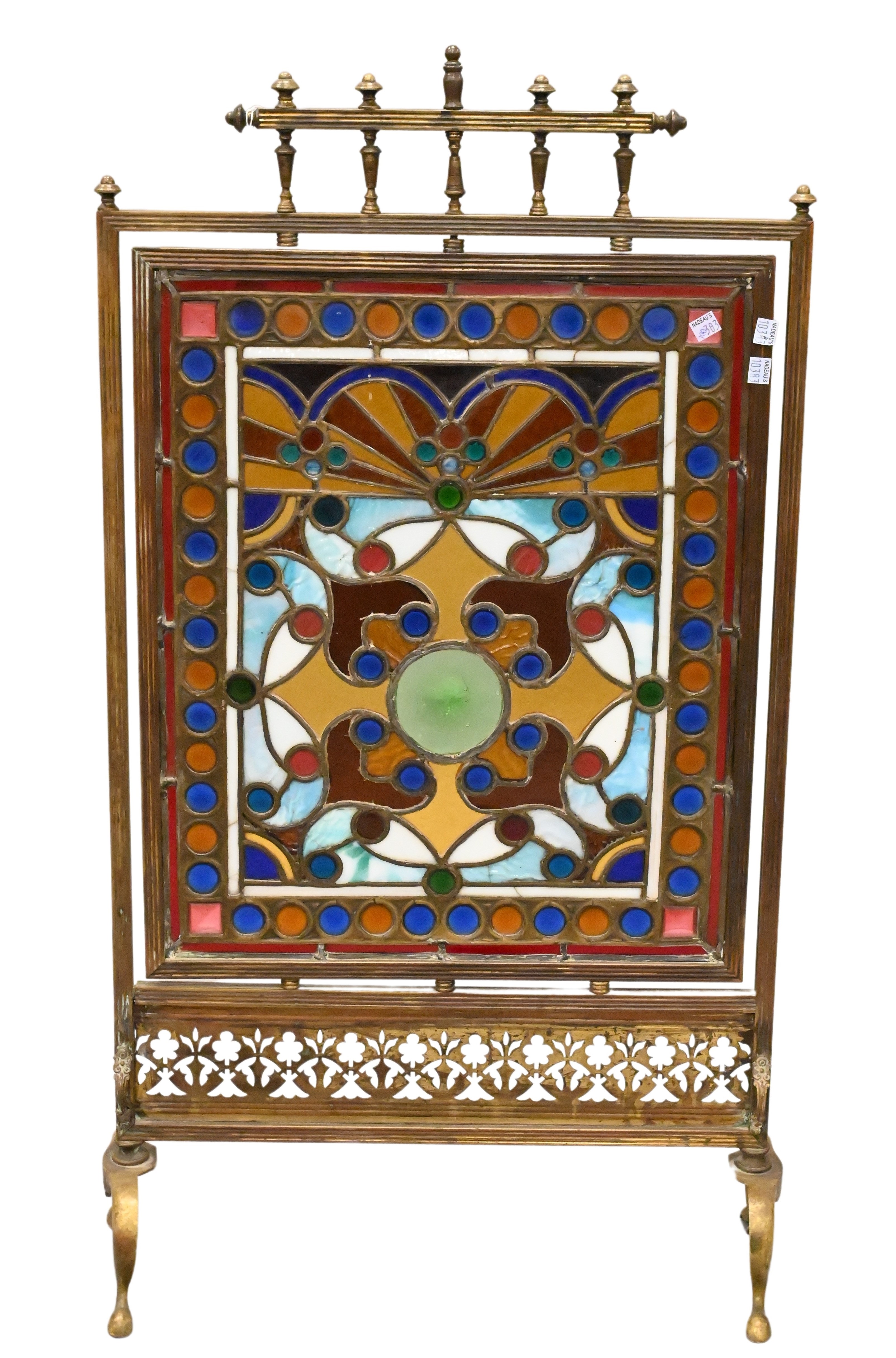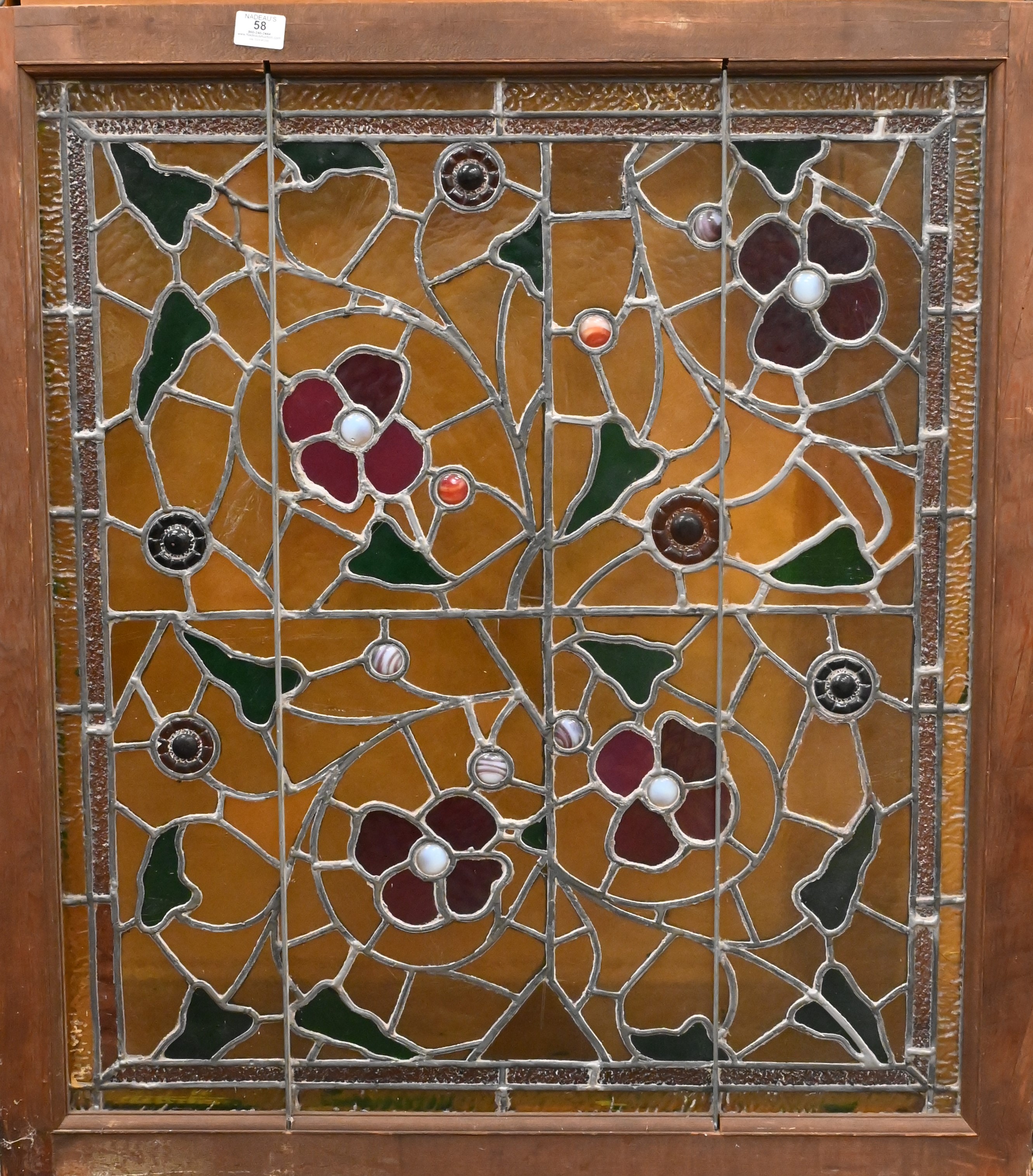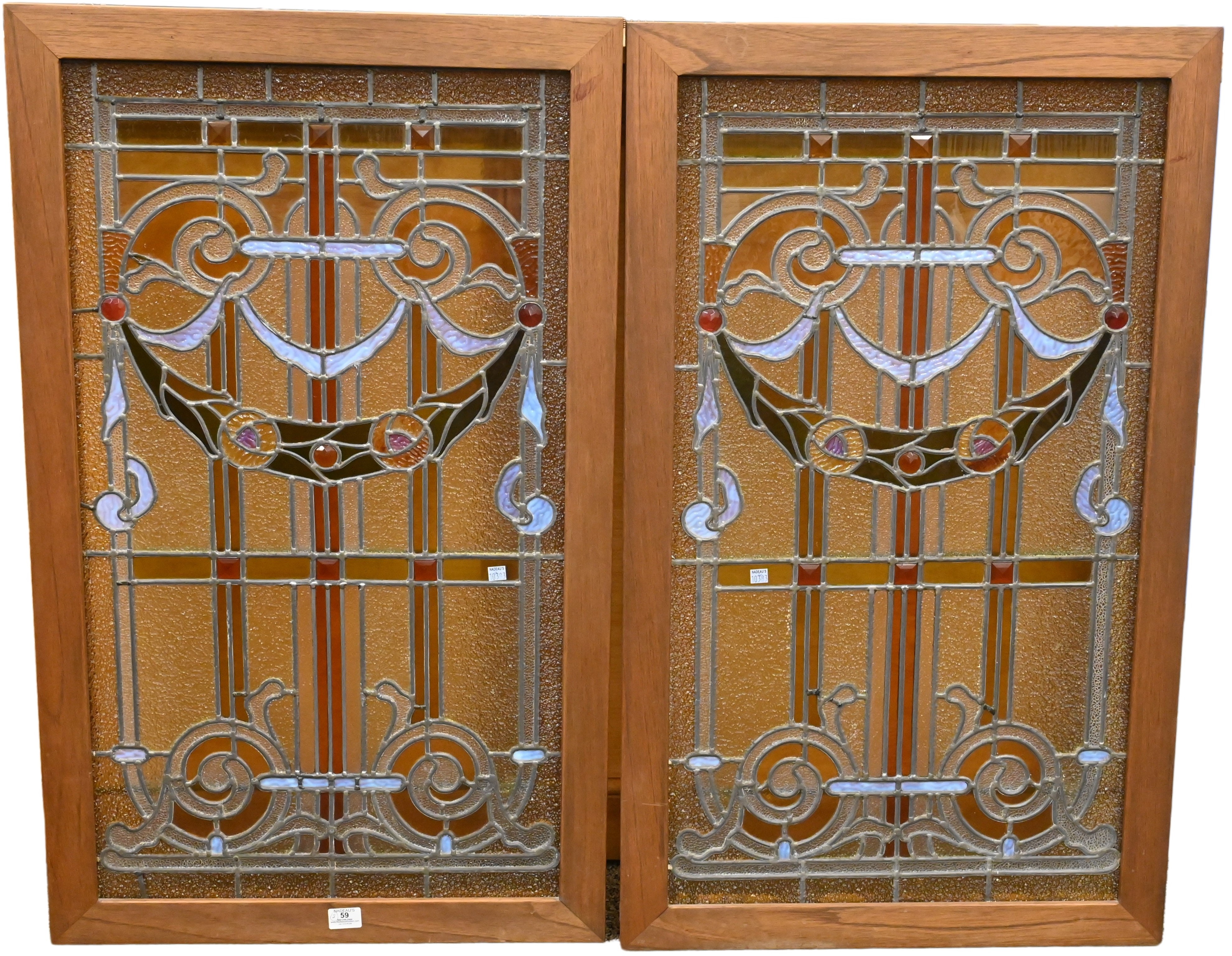 transom stained and leaded glass window with birds and vase of flowers, along with three shaped leaded and stained glass panels having hanging hooks and brass trim