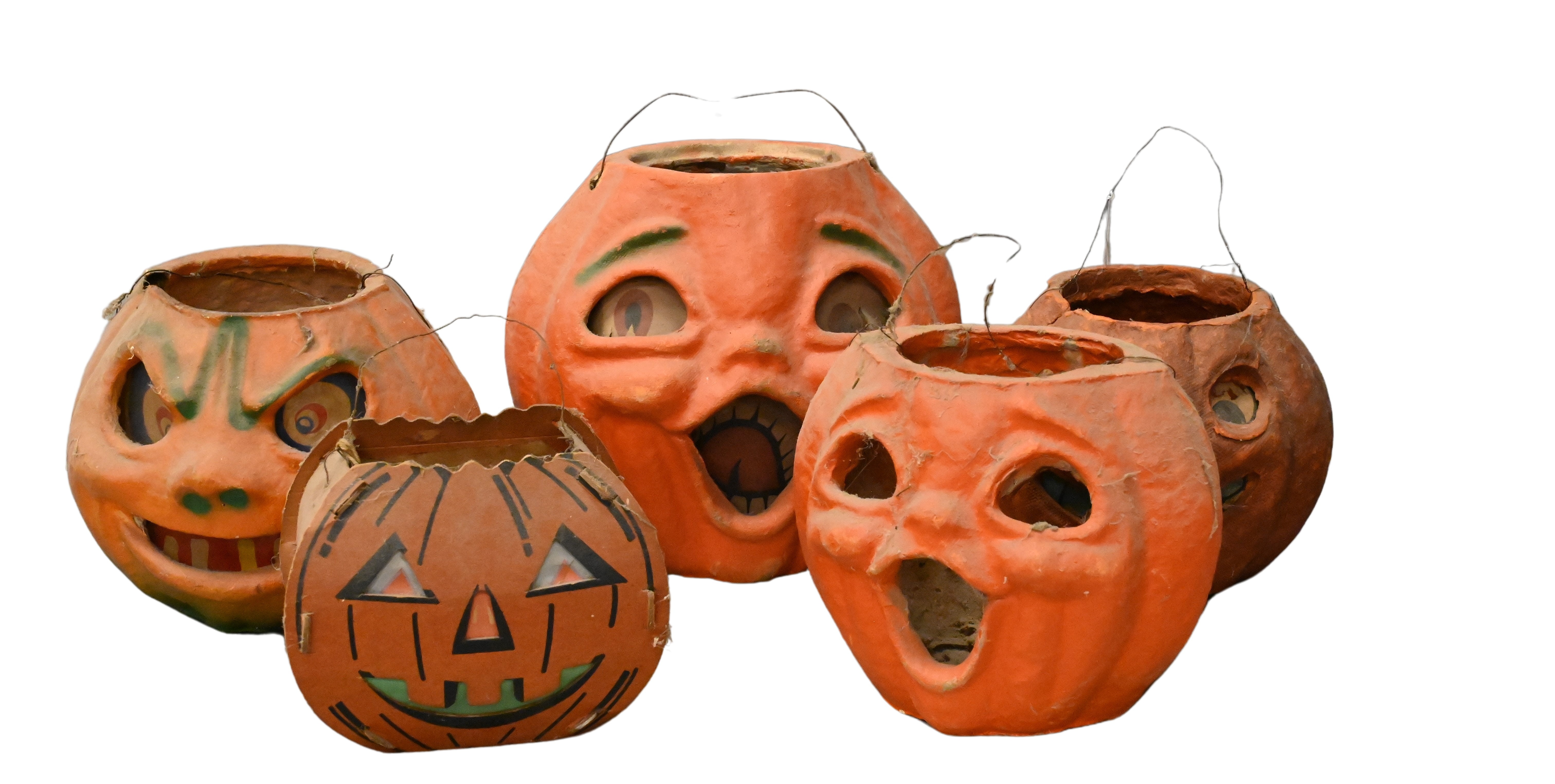Seven Vintage Papier Mache Jack-O-Lanterns