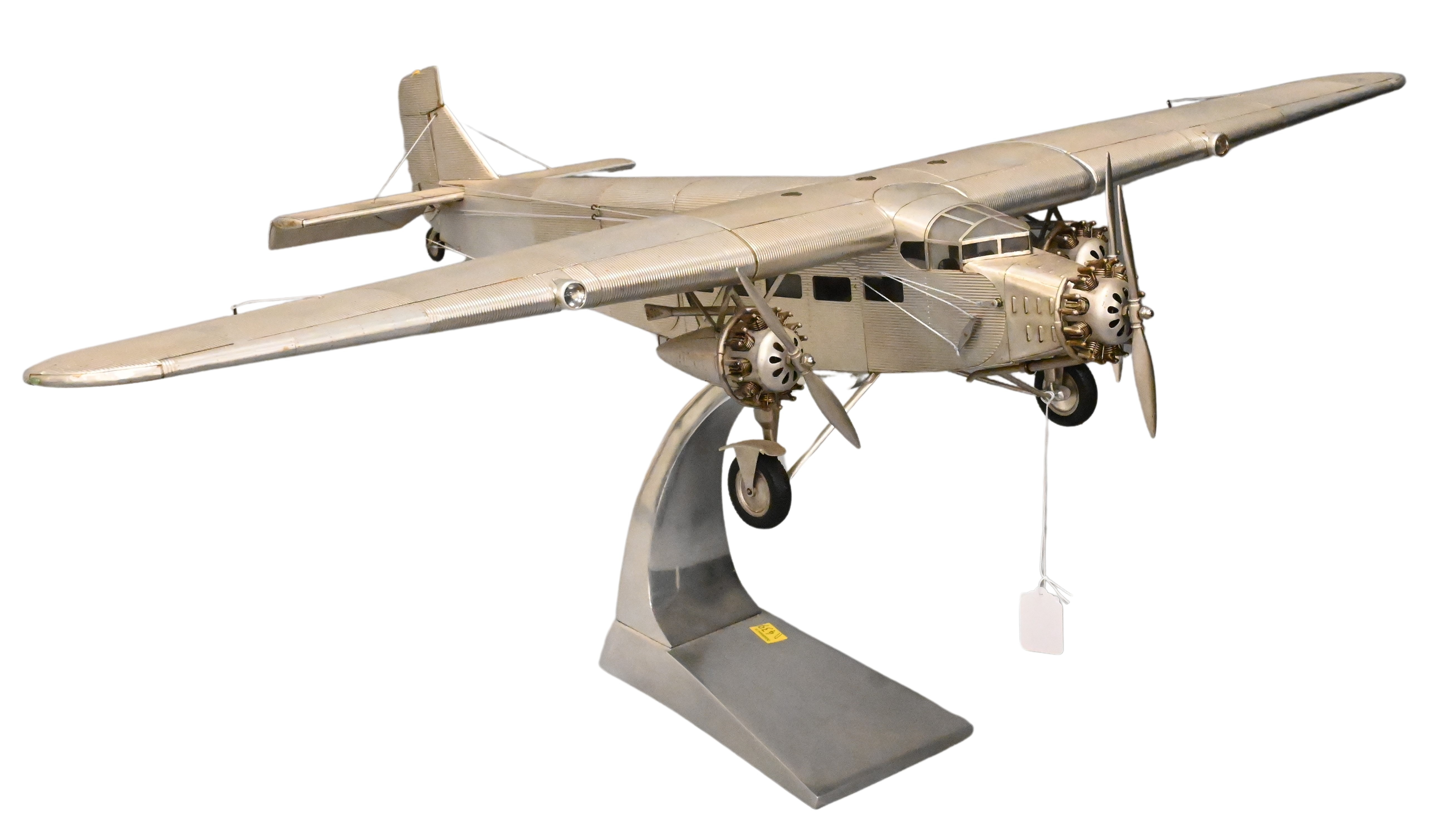 “Tin Goose” Ford Trimotor model airplane, 1926 handmade, aluminum and wood, having detachable wings along with display stand