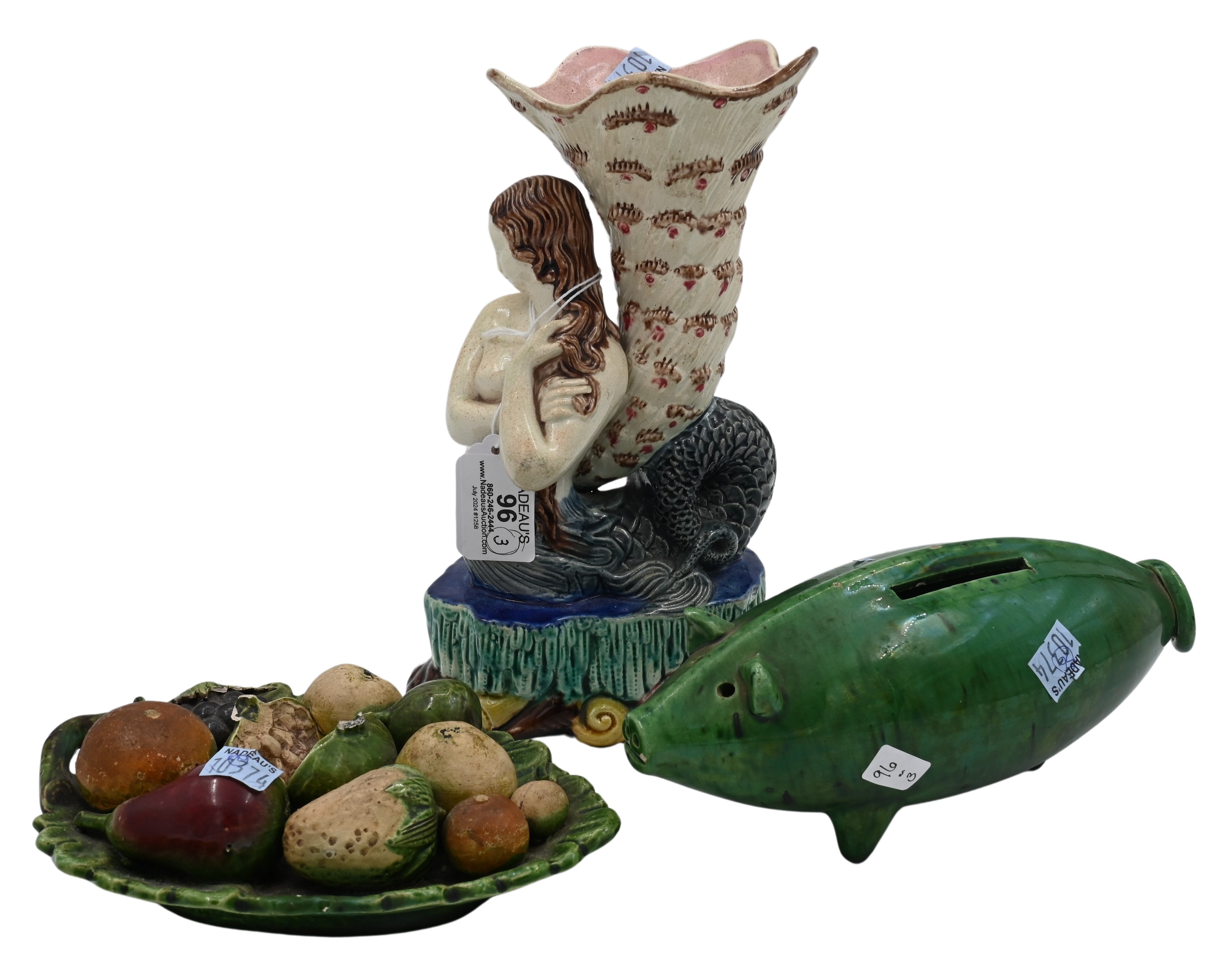 to include Netherlands Ceramic Workum/Gouela green glazed pig piggy bank, Jose A. Cunha successor fig plate palissy ware from caldas, mermaid center vase marked on bottom
