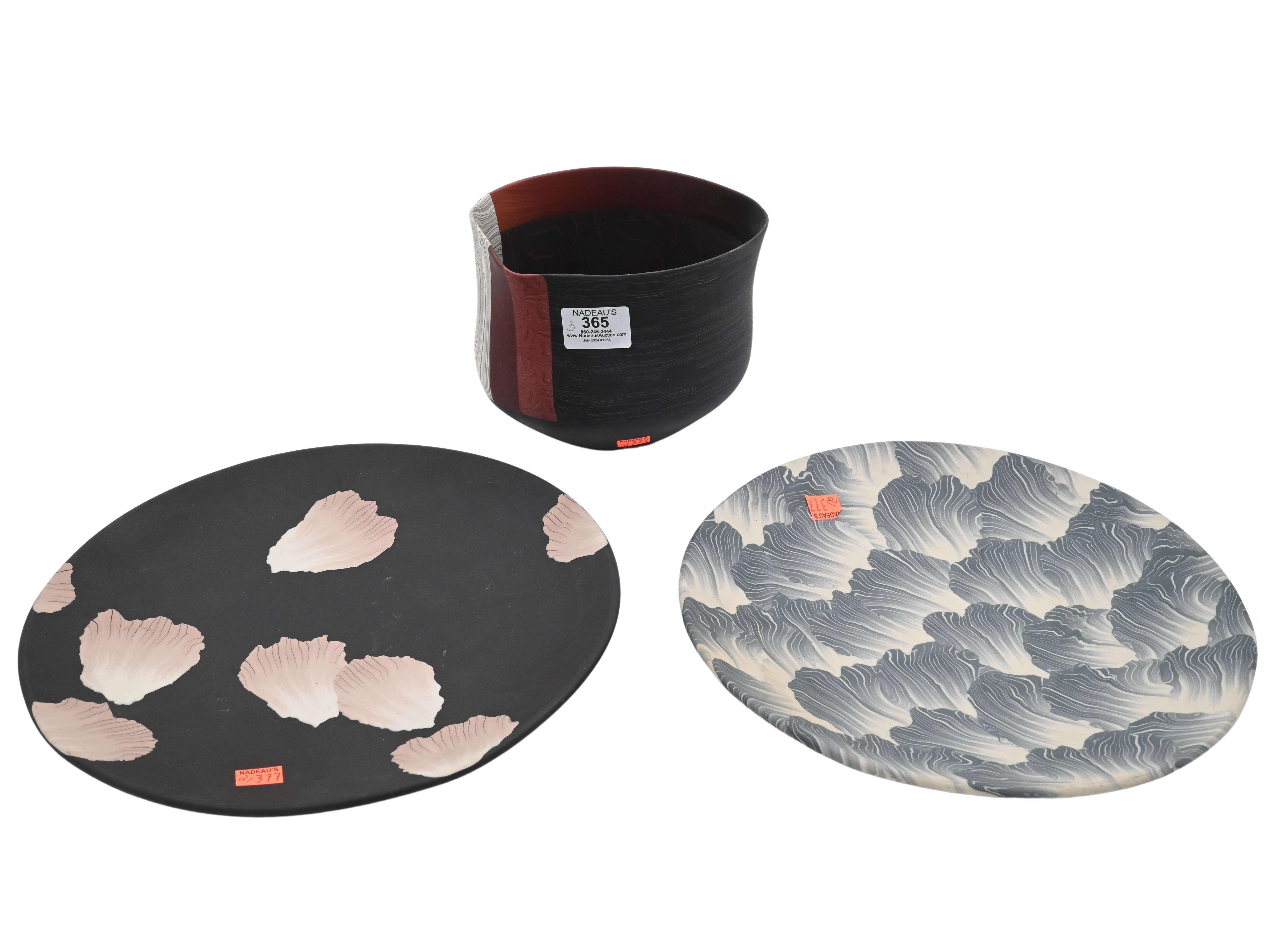 Nerikomi porcelain bowl signed on base “TH”, black porcelain plate having flower petals signed on base “TH”, blue gray porcelain plate having wave design signed on base “TH”