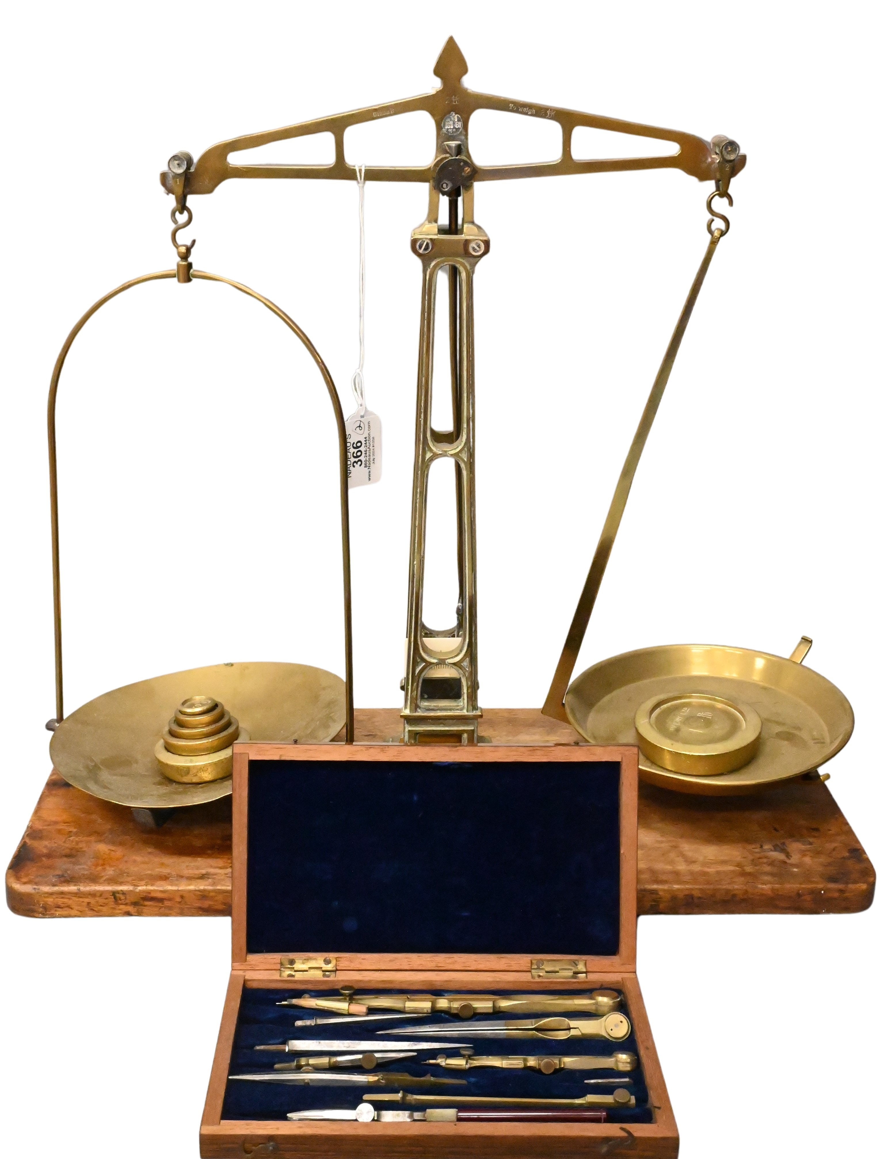 stone scale set on wood base with weights, 19th century, along with K & E Draftsman inlaid tool kit