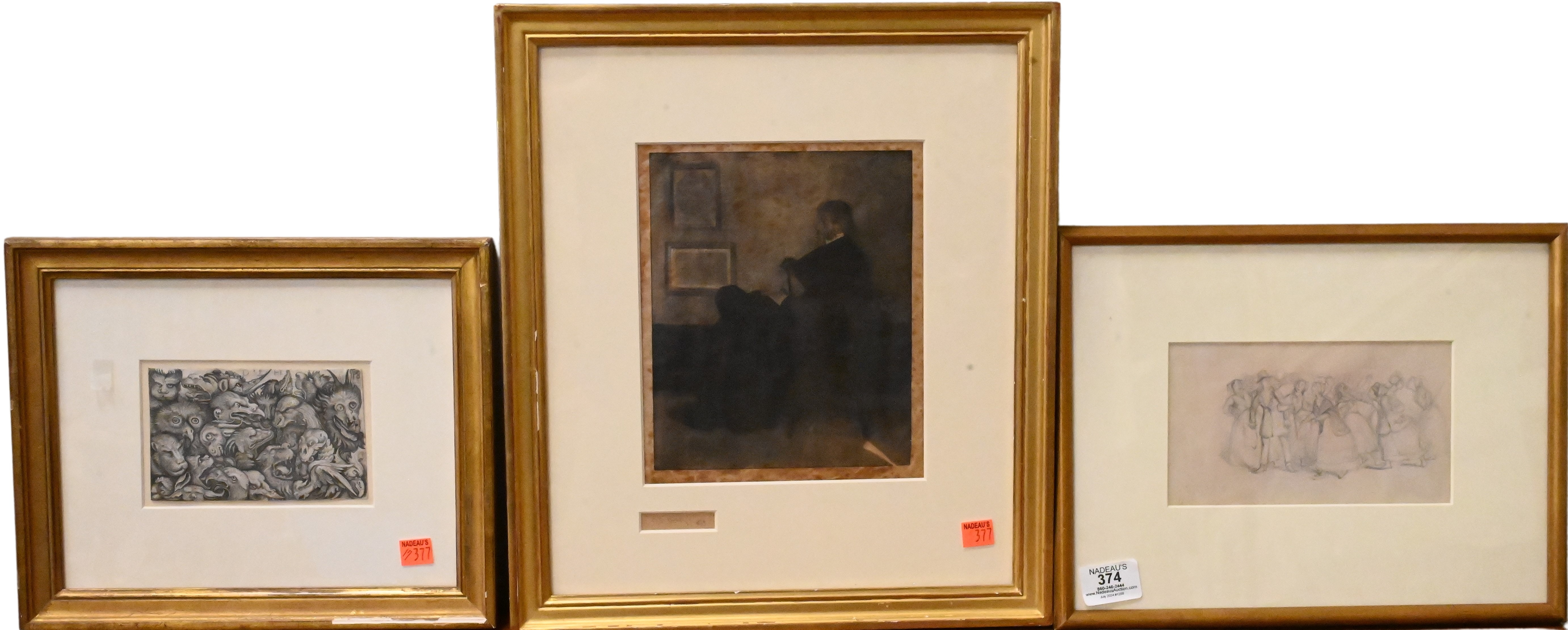 Watercolor on tissue paper featuring a boar’s head, drum, mask, etcetera signed and dated lower right 1846