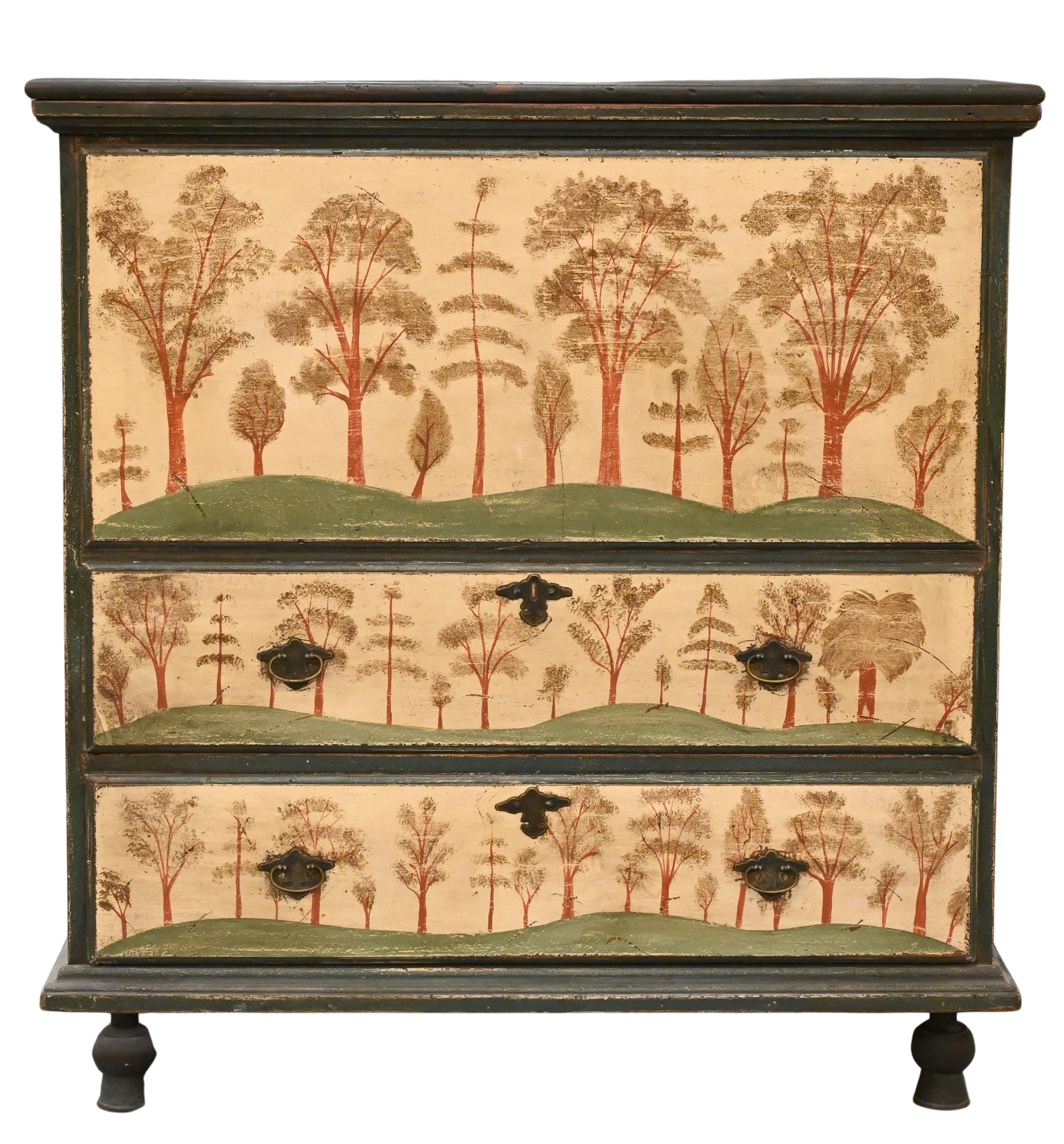 having three smaller drawers flanked by six larger drawers, with metal circular pulls