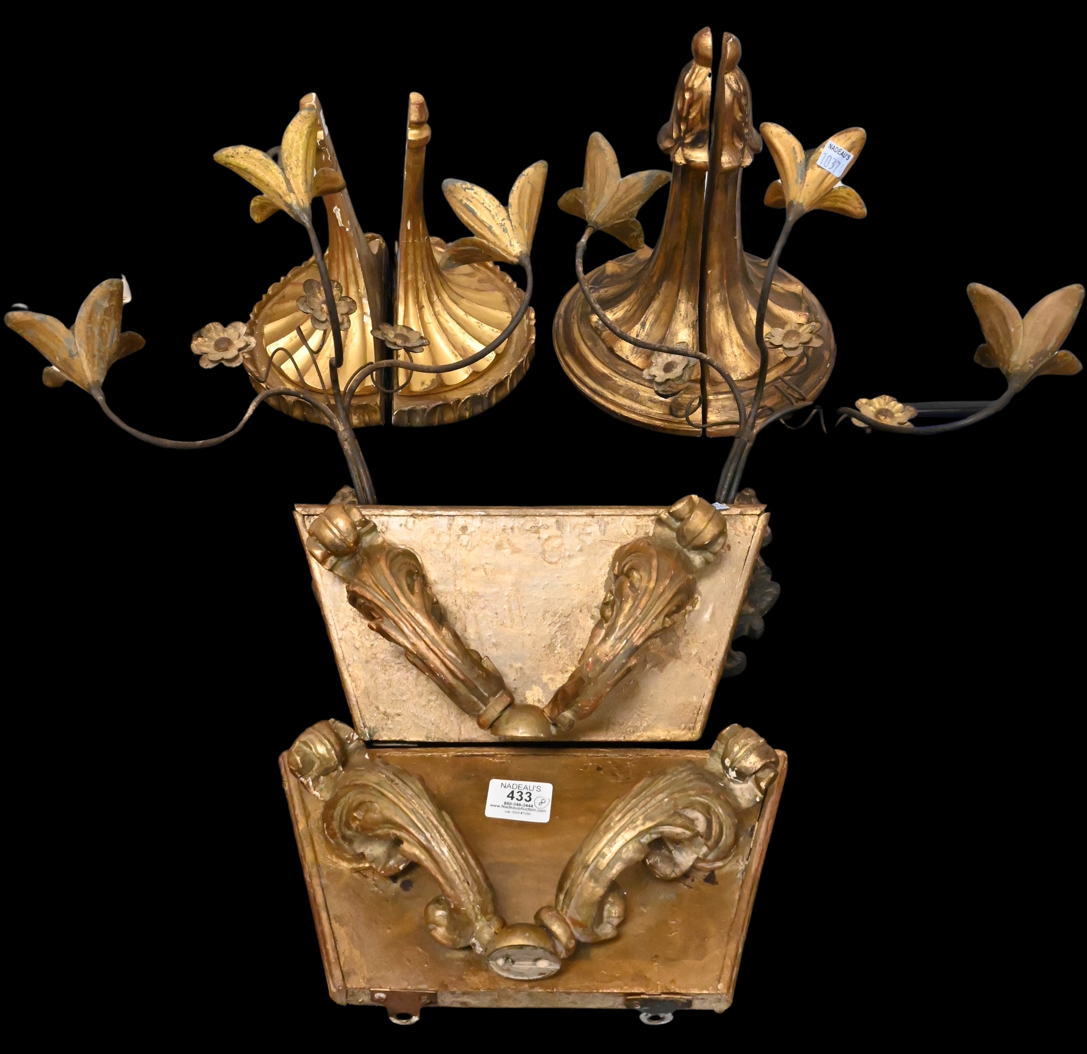 to include a pair of gilt hanging shelves/wall brackets, pair of gilt and metal floral sconces, and two pairs of Italian style carved shelves