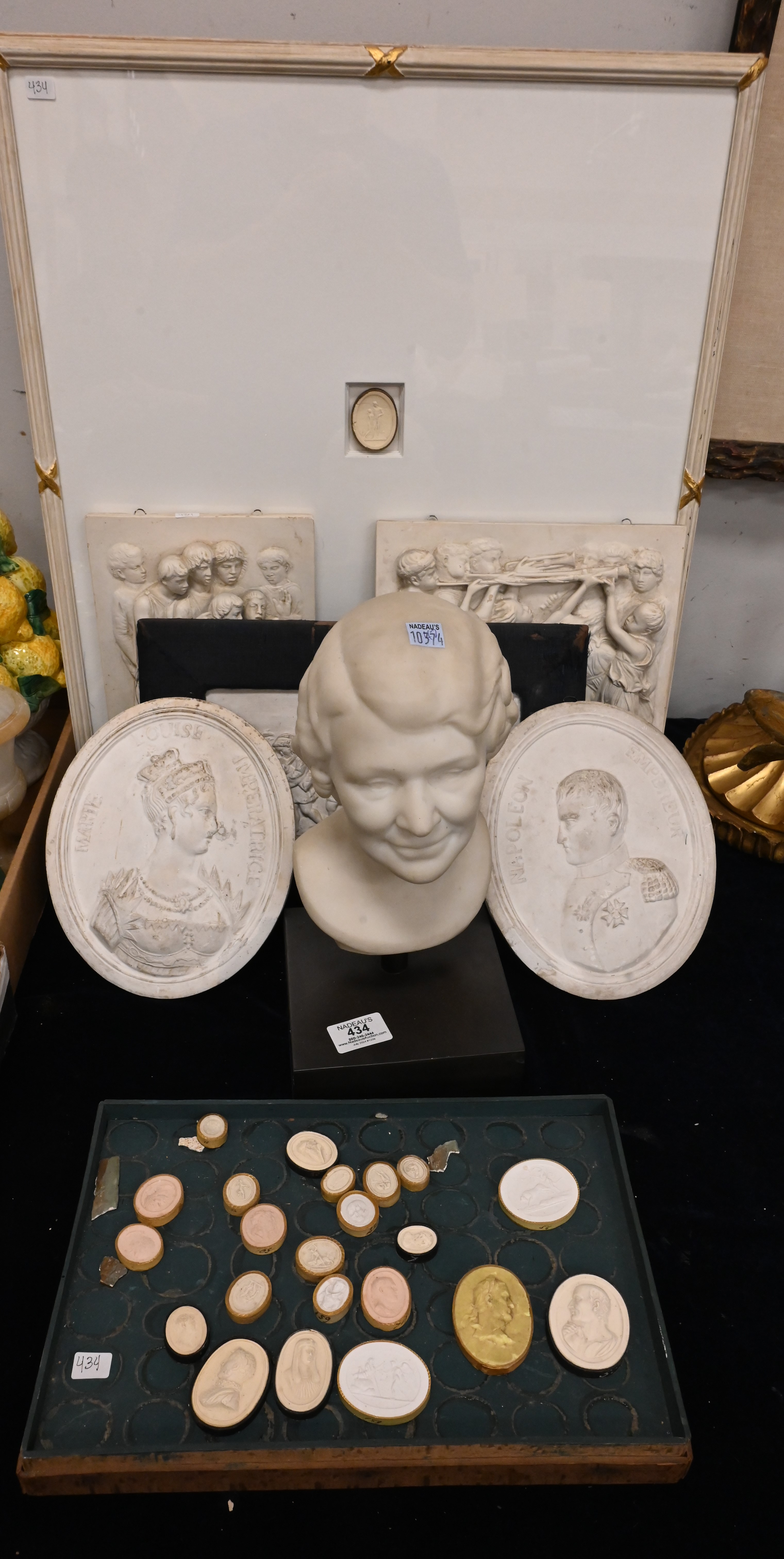to include pair of portraits of Napoleon and Marie Louise, assorted miniature intaglios, “Trumpeters with Dancing Children” after Luca Della Robbin, choir boys plaque, framed plaque of cherubs, marble bust