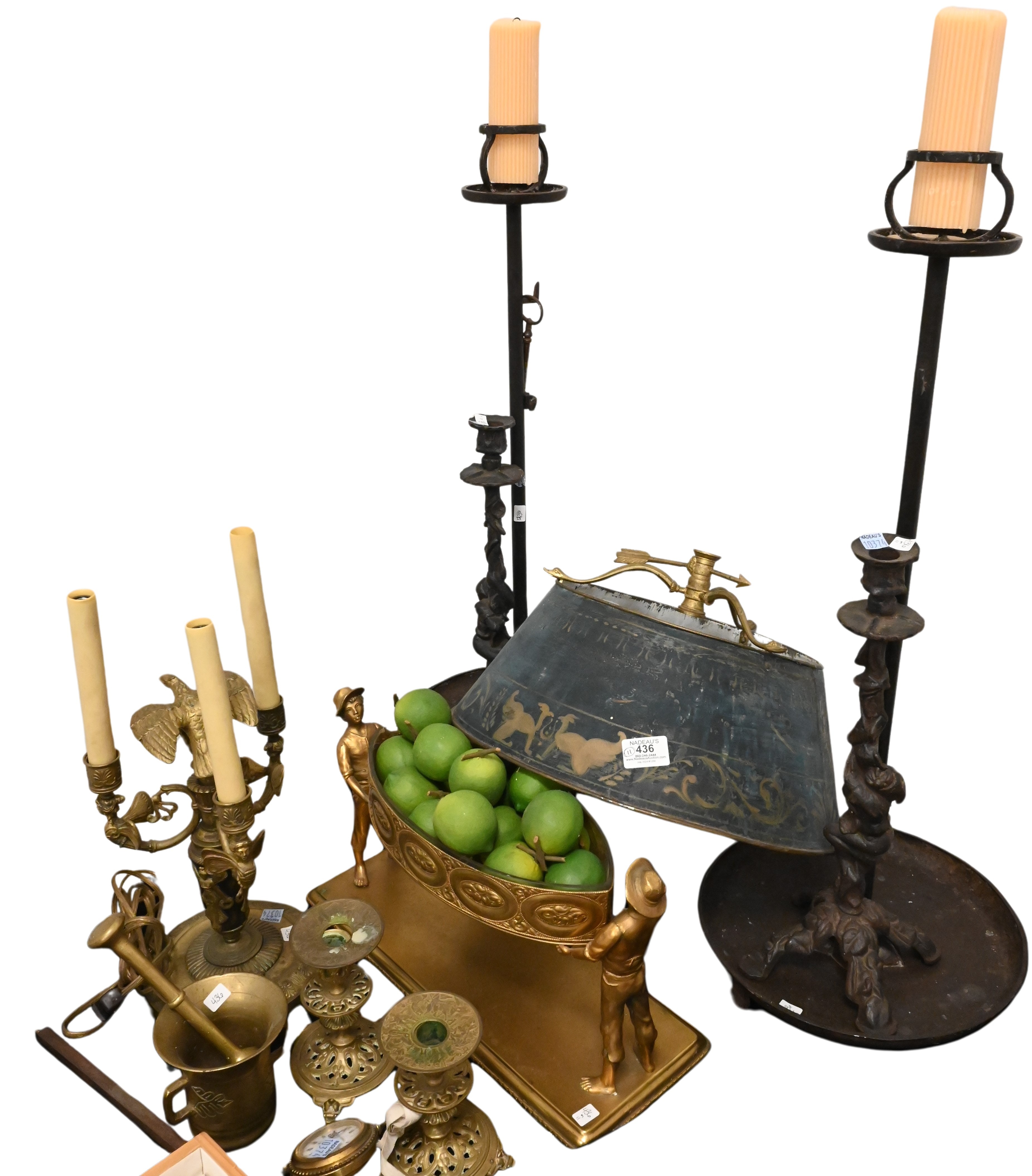 to include Neoclassical three light candelabra having eagle finial, pair of candlesticks, mortar and pestle, Swiza Sheffield watch, pair of iron candle sticks, iron pricket stand, and center bowl having two smoking figures