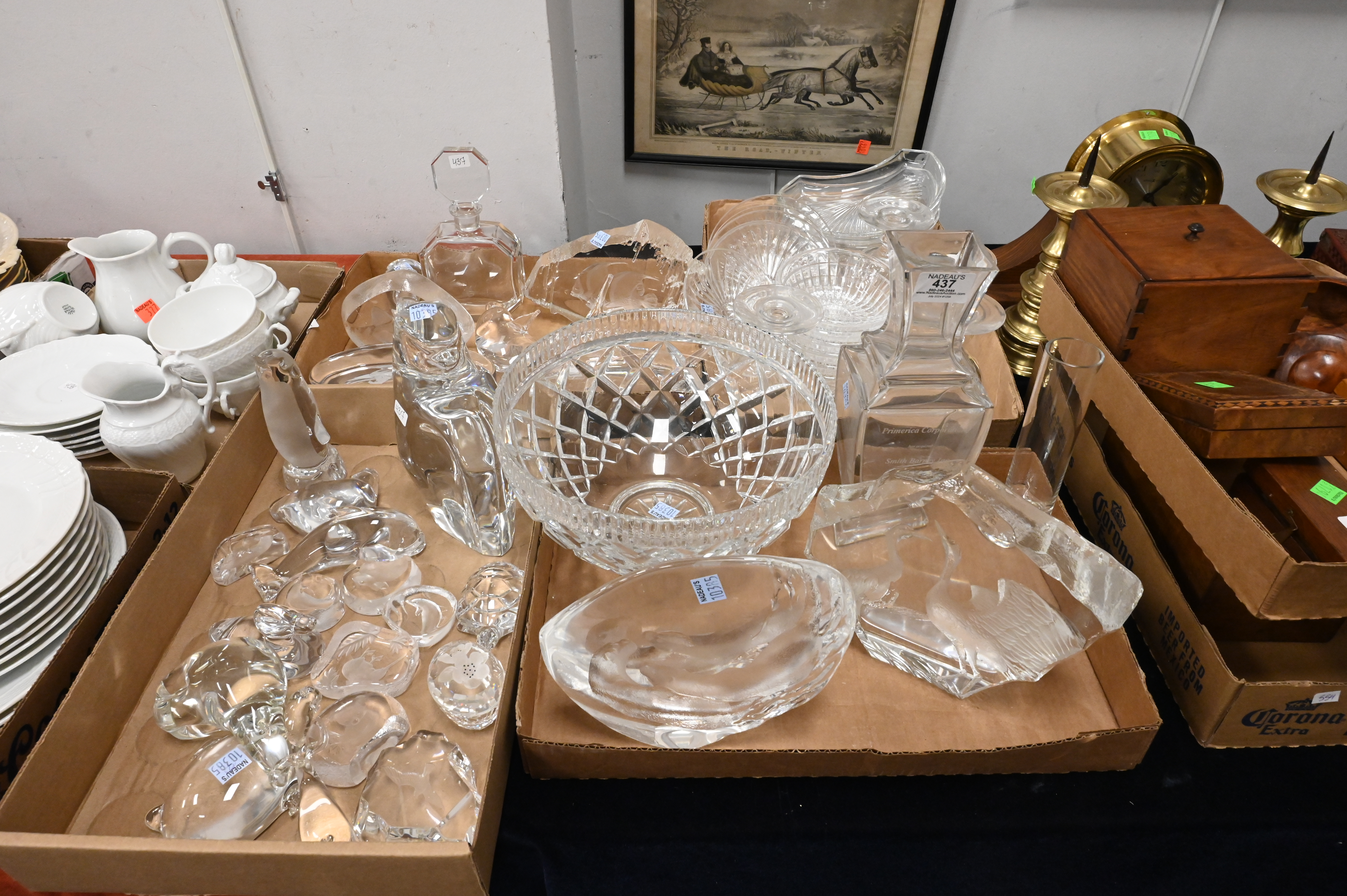 to include 12 Mats Jonasson Swedish crystal paperweights, assorted animal figures, Val St. Lambert dishes, etcetera