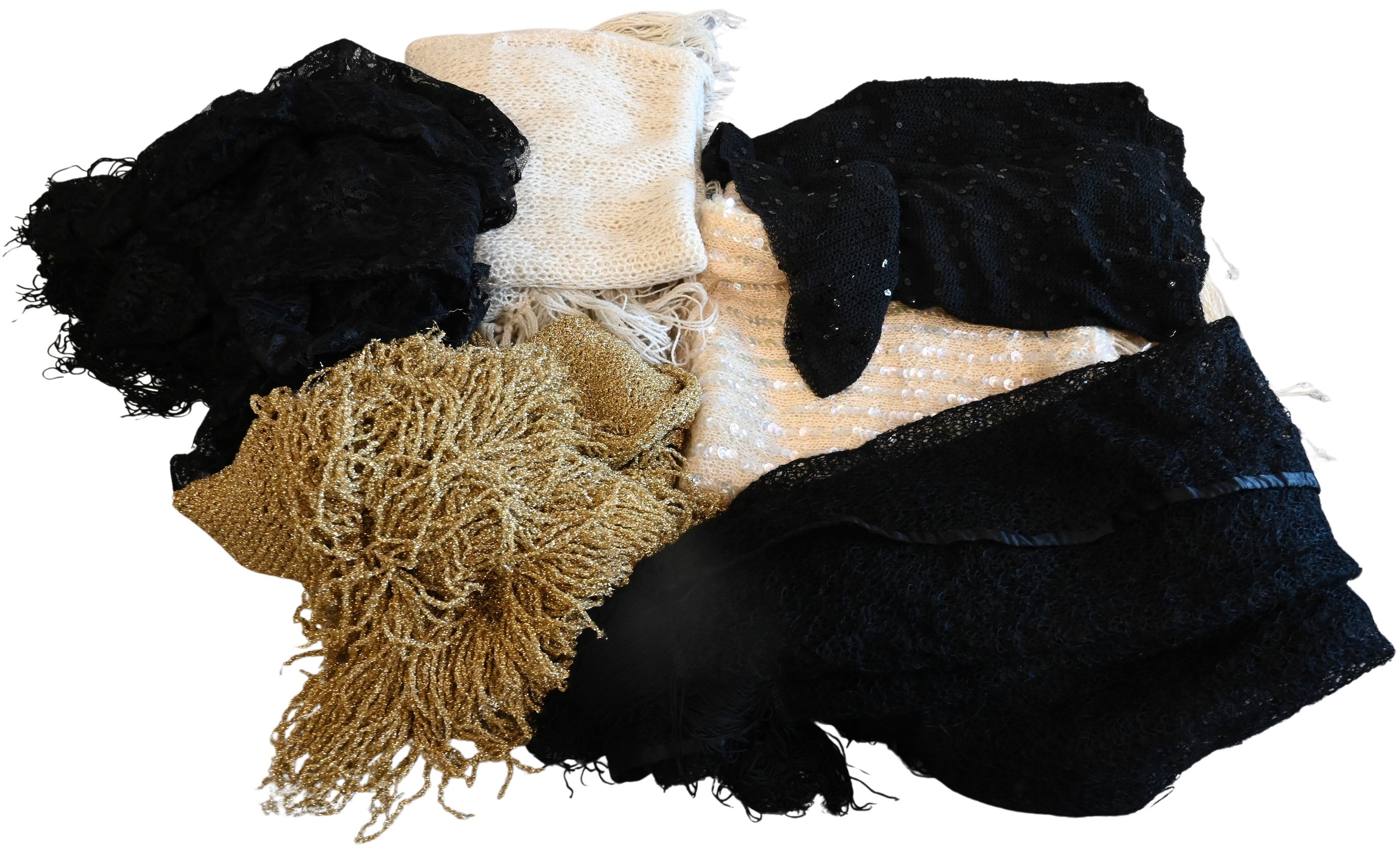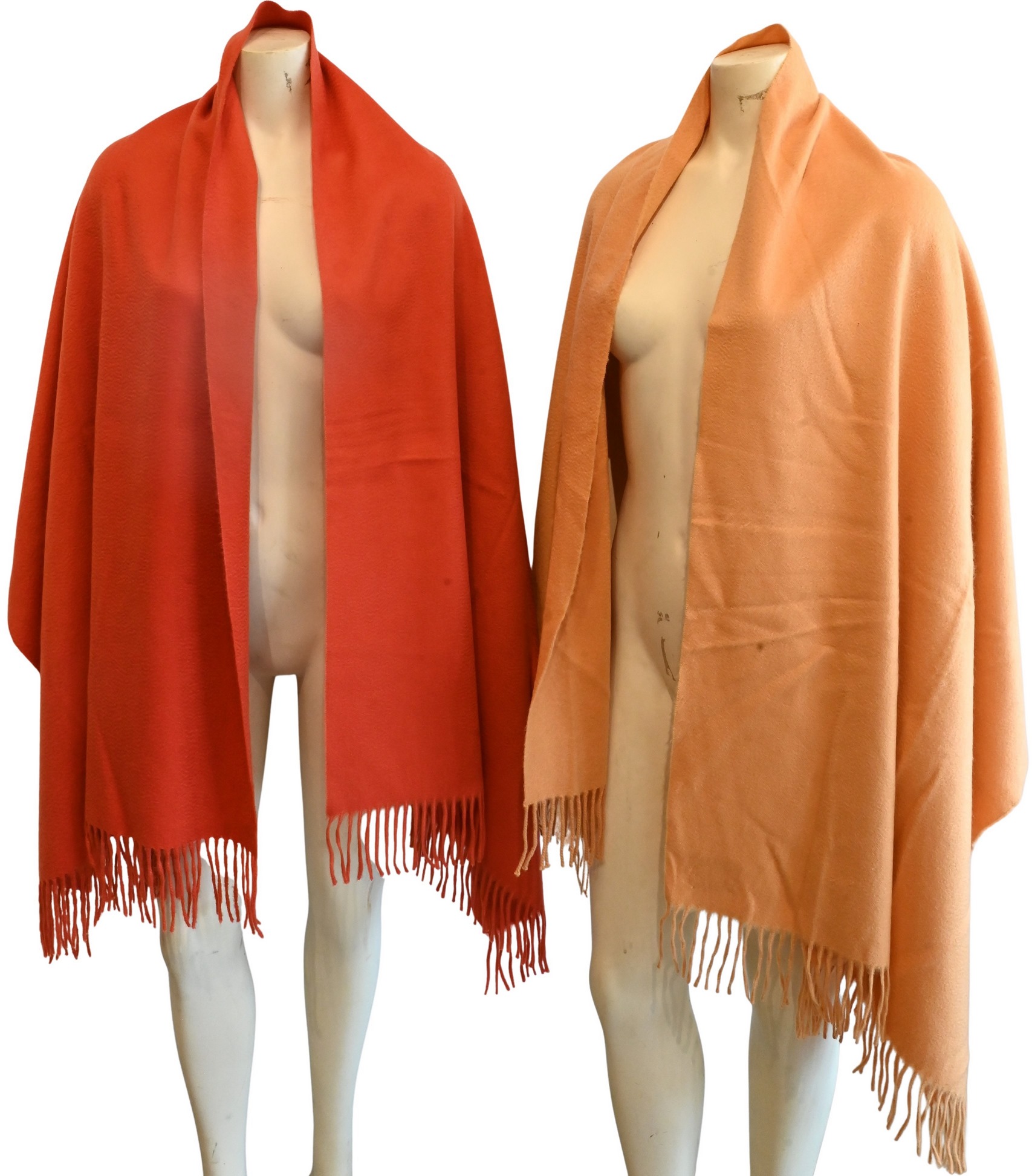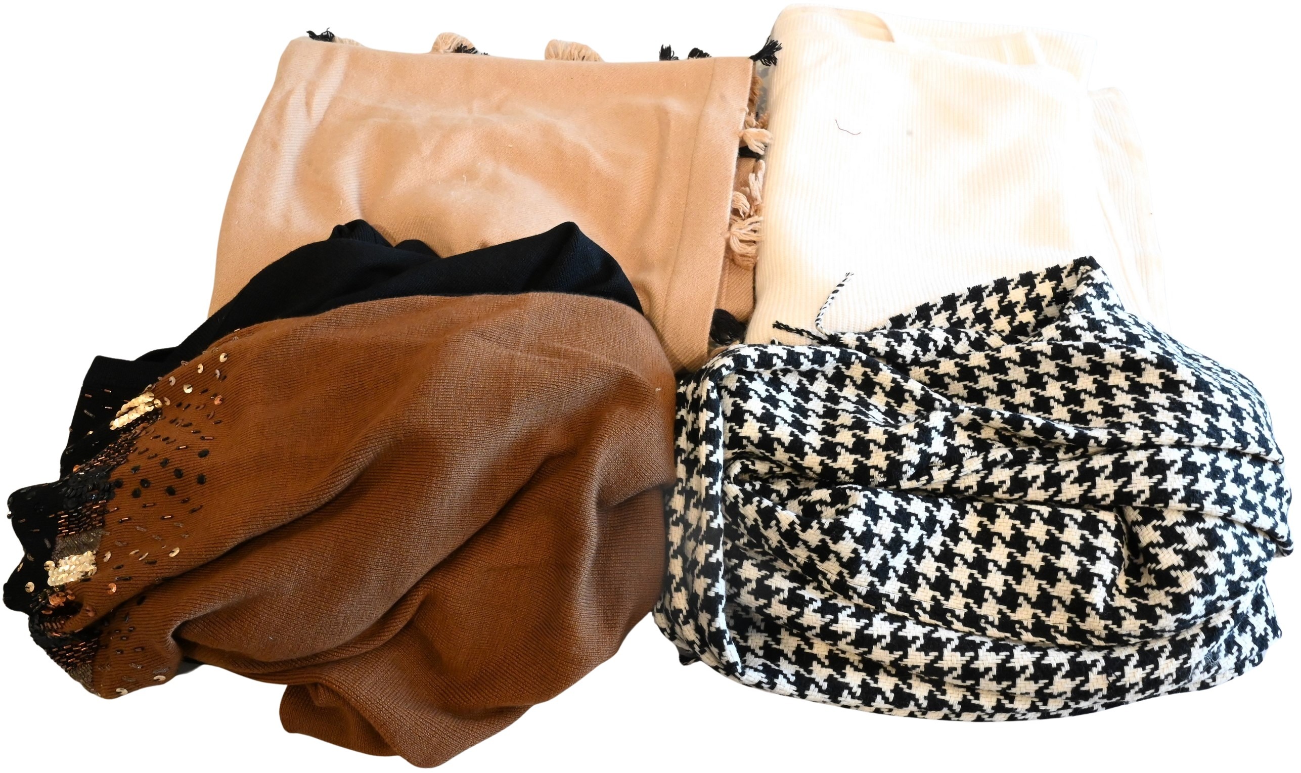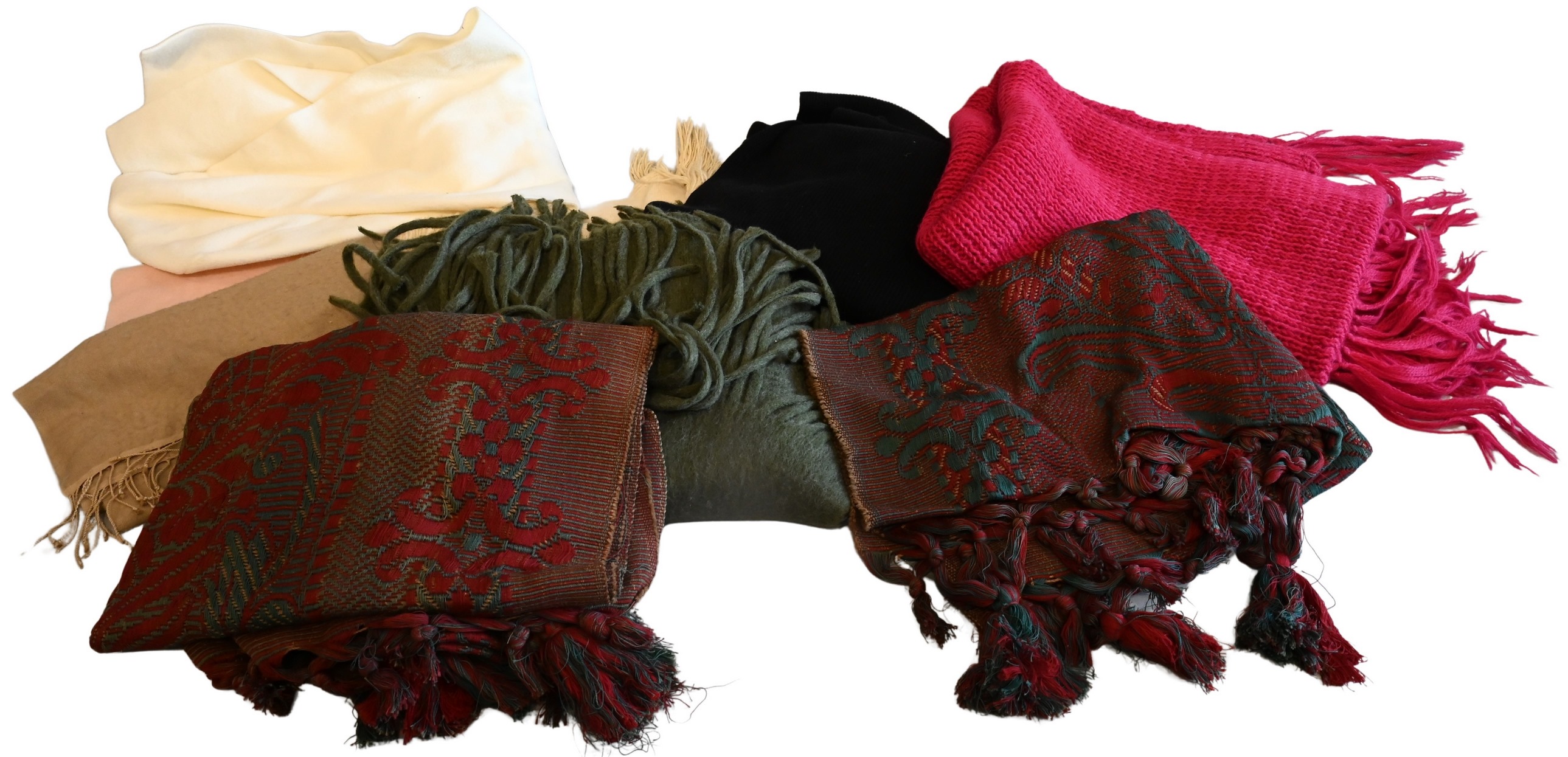 to include three scarves in yellow, pink, and brown, Anthropologie shawl in green, black shawl, pink shawl, white cape having hood, and two blankets in red and green