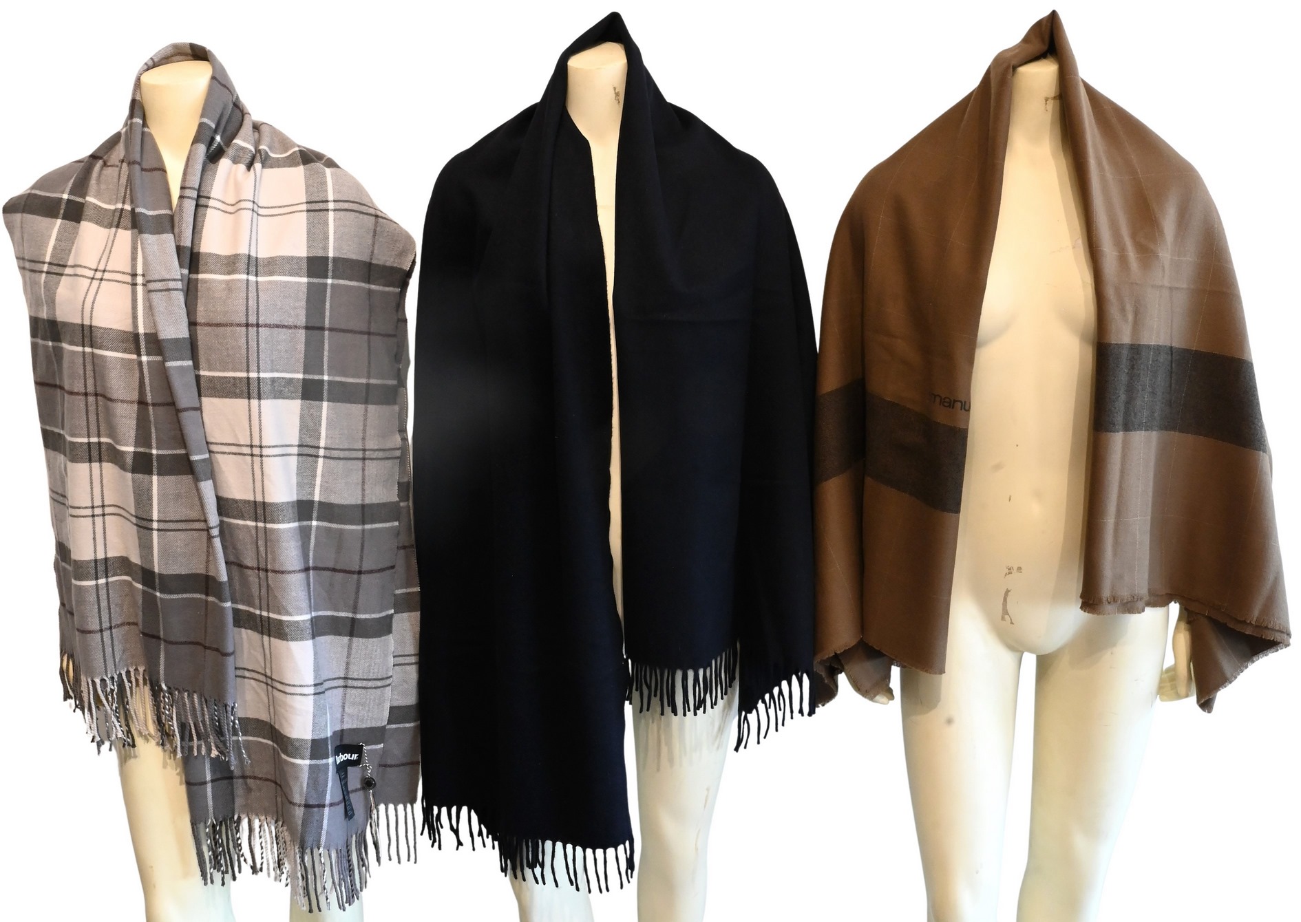 to include Emanuel Agaro in dark green, Escada in navy blue having fringed ends, and Barbour in checkered grey having fringed ends