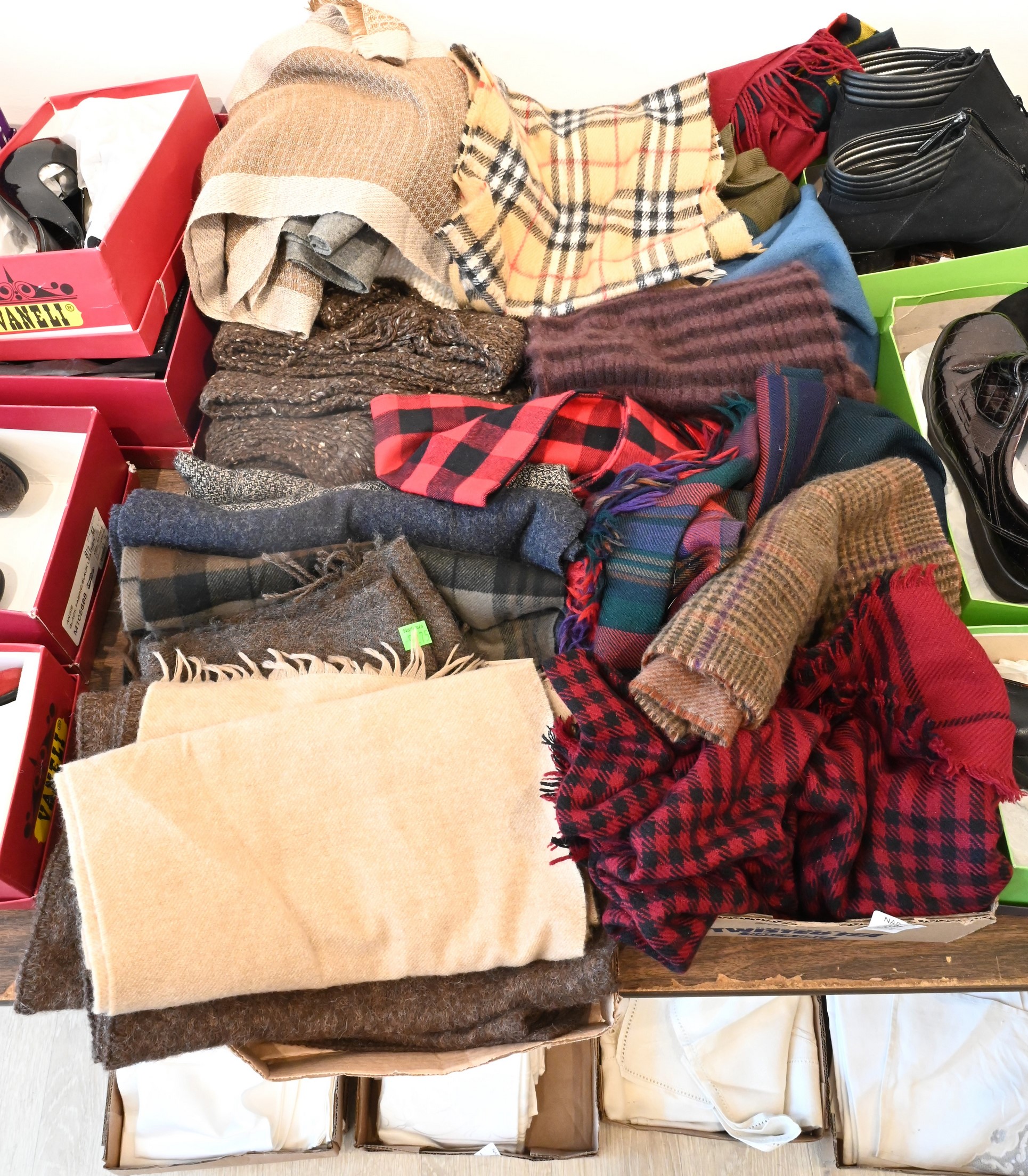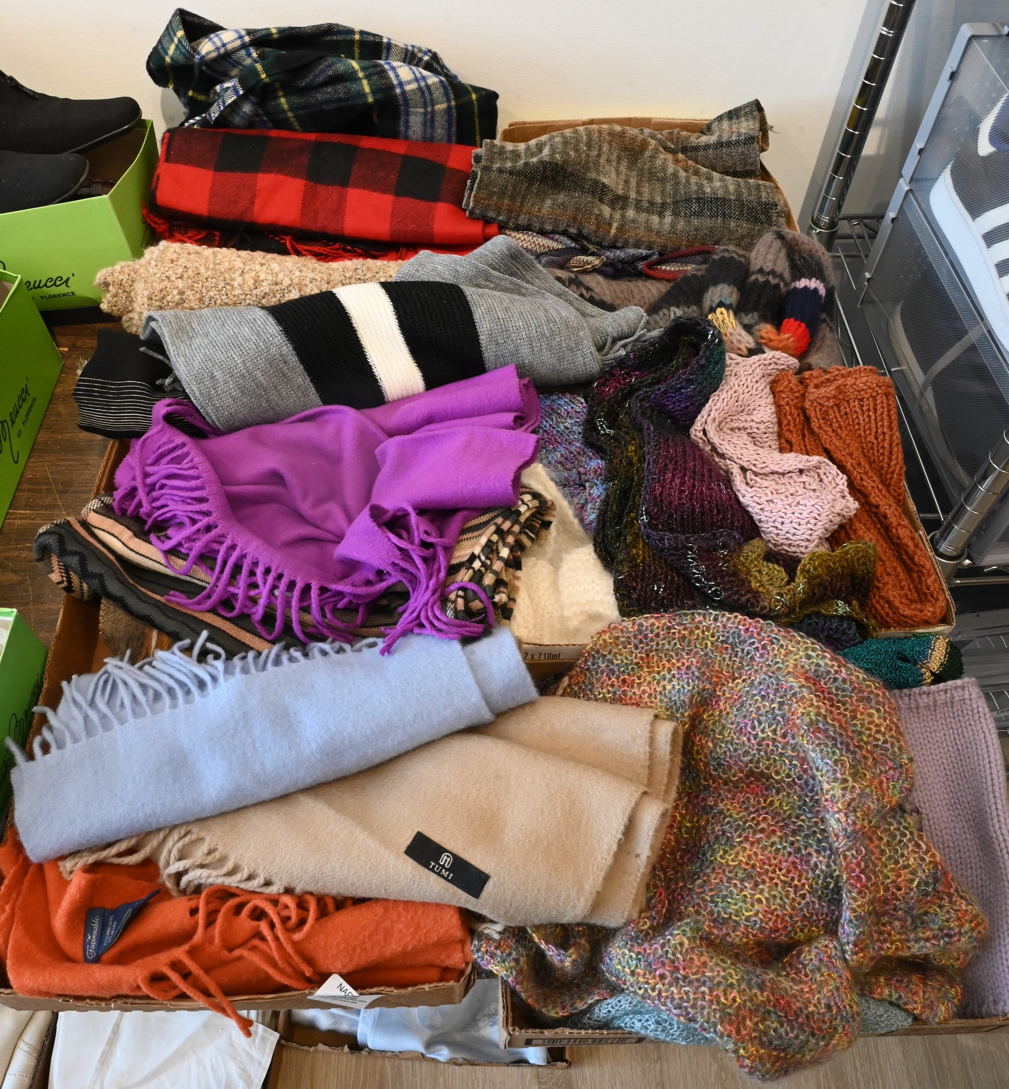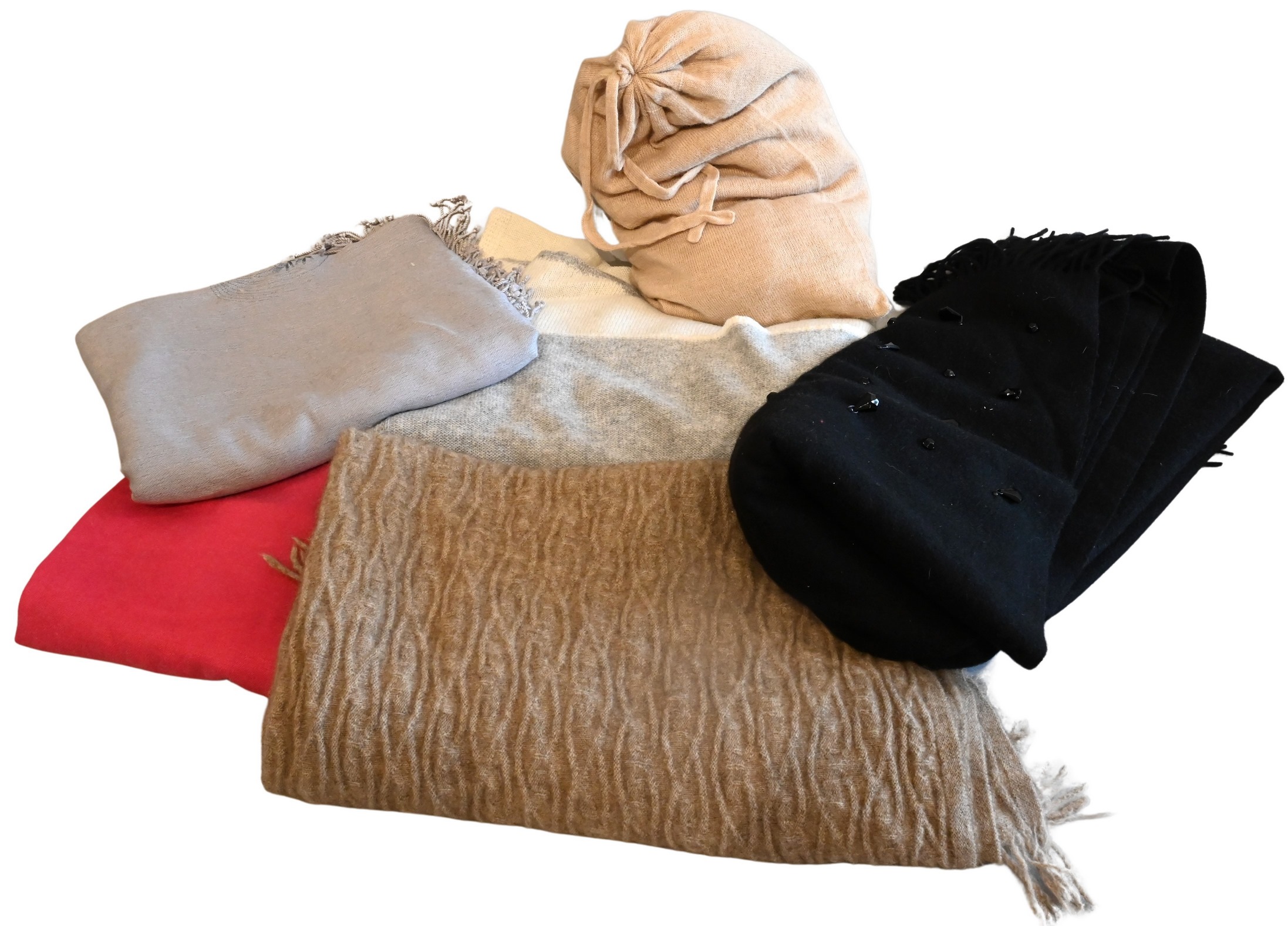 brown and white made in Scotland, brown and black made in Scotland, Yves Saint Laurent in brown and white, Johnstons in grey, black made in England, Saks Fifth Avenue in blue, Tasselli cashmere scarf in multi color, two Tasselli cashmere gators, Gimbels cashmere scarf, and a pack towel, hat in grey, hat in black, hat in white cashmere, hat in red and white