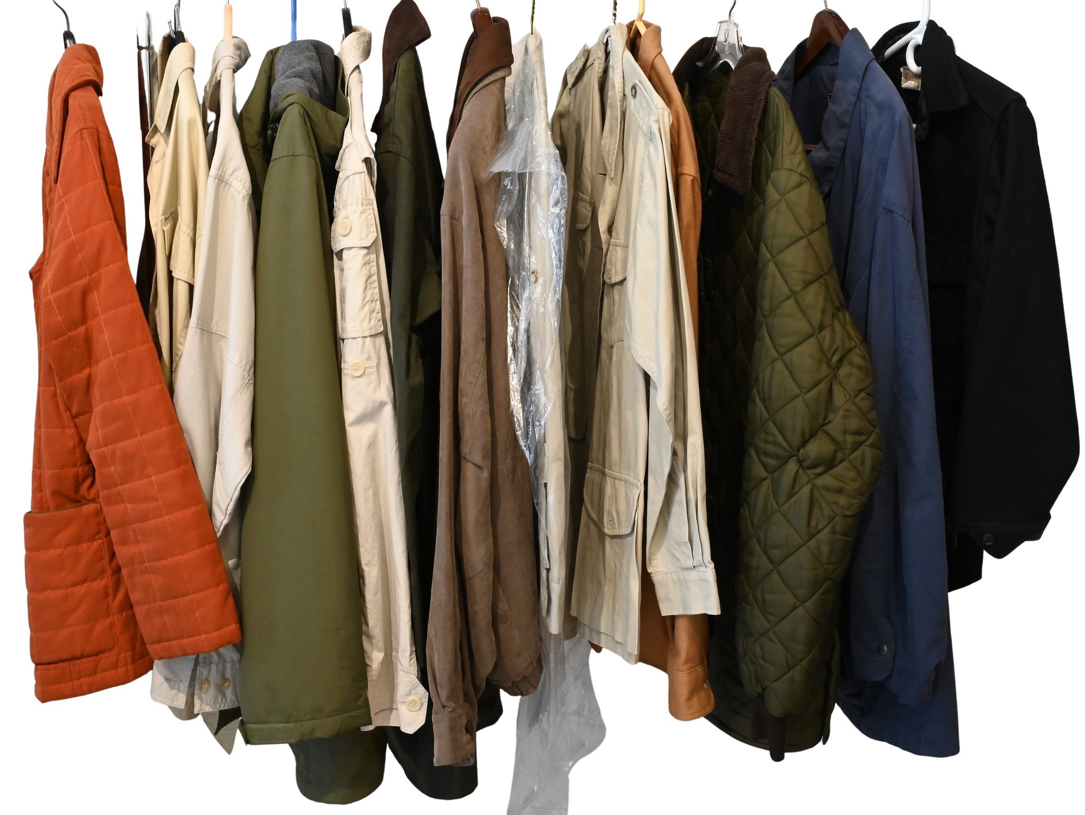 to include rainforest green suede size XL, Barbour wax hunting jacket, Beretta shirts, Lands End jacket