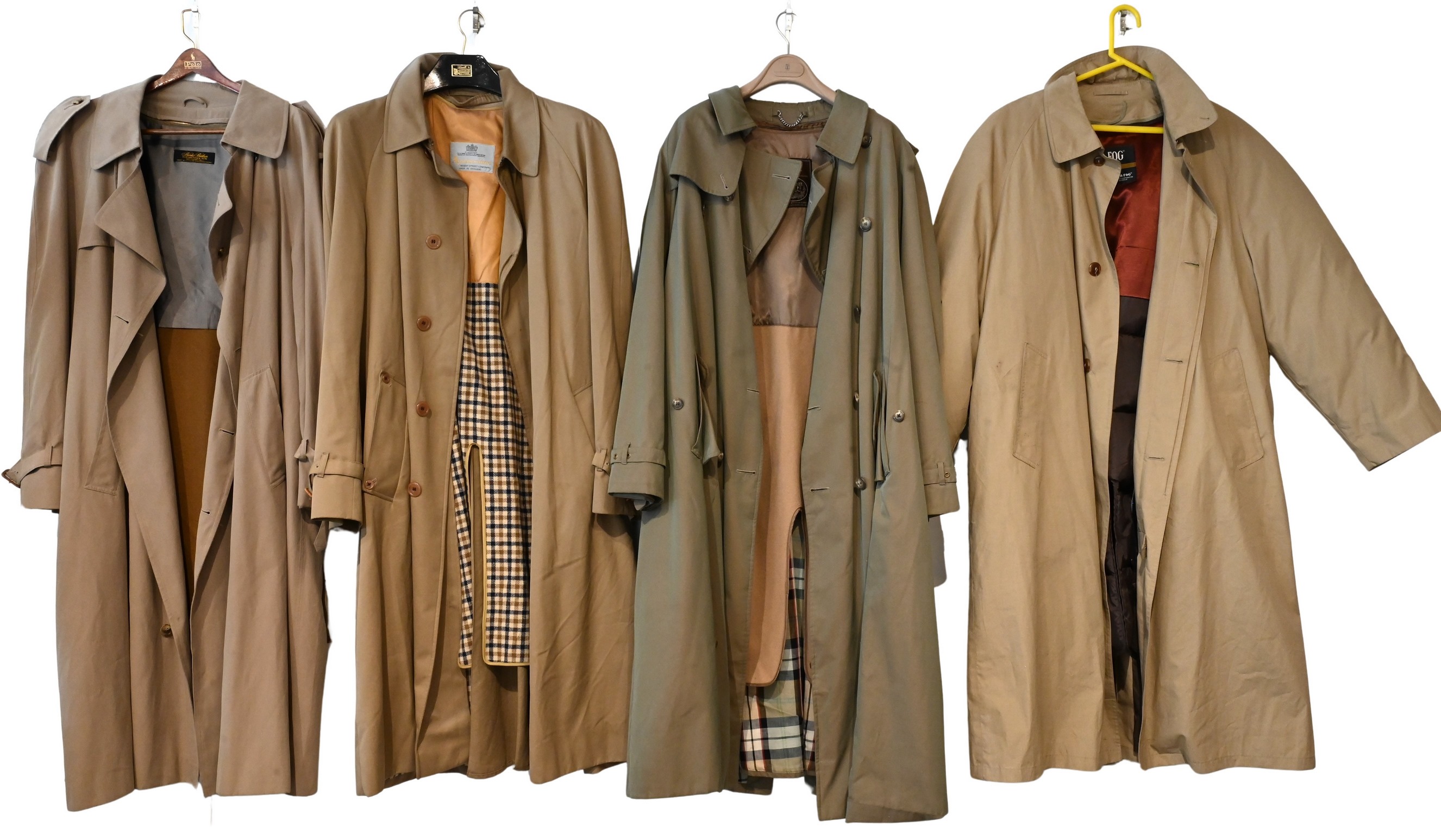to include London Fog single breasted coat having puff liner in khaki, Paul stuart double breasted coat in olive green having liner and belt size 44, Brooks Brothers double breasted coat having liner