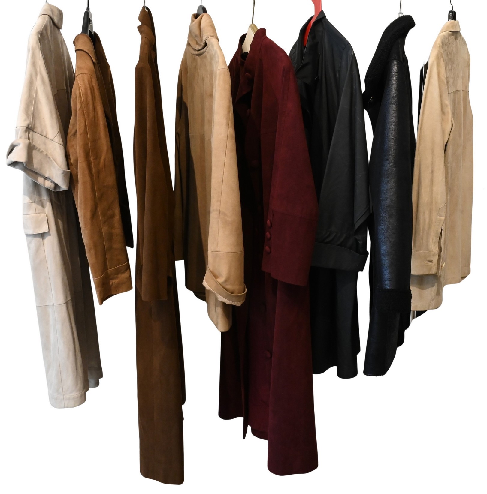 to include B. Clemo Hd red full length coat, suede turtleneck, Italian suede button jacket in beige, brown leather full length coat, etcetera, small sizes