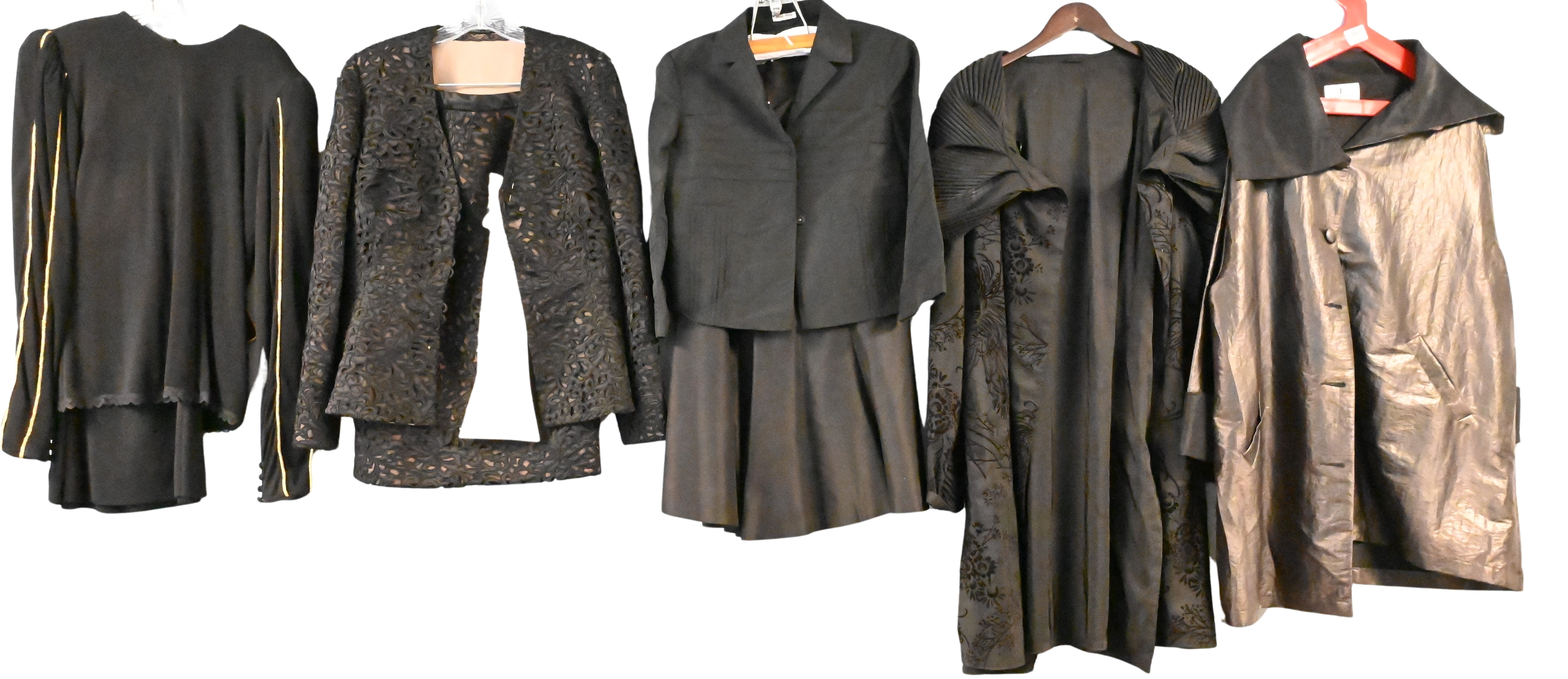 to include Peggy Jennings skirt and blazer set, Miu Miu Italy skirt and blazer set size small, Emmelle 3/4 length jacket size 1, black and gold vintage embroidered skirt and blouse, custom black embroidered coat