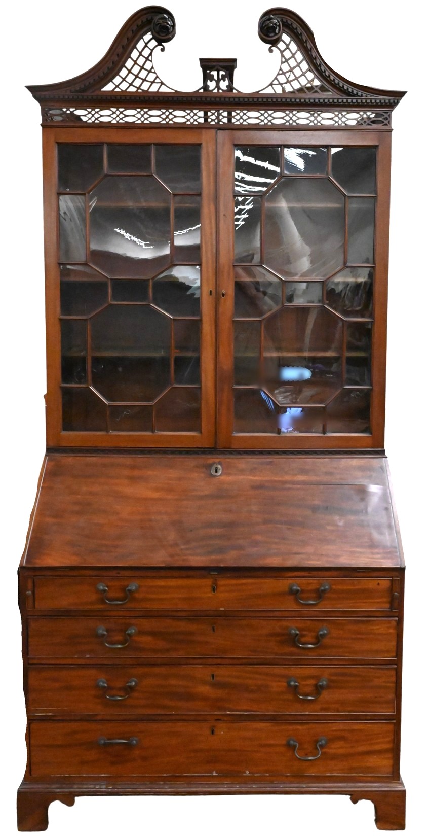 in two parts, upper section having pierce carved pediment over two glazed doors on lower section with slant lid desk opening to reveal drawers and pidgeon holes, felt writing surface over four drawers set on bracket base, circa 1780, cracks to lid veneer small chips, normal wear consistent with age