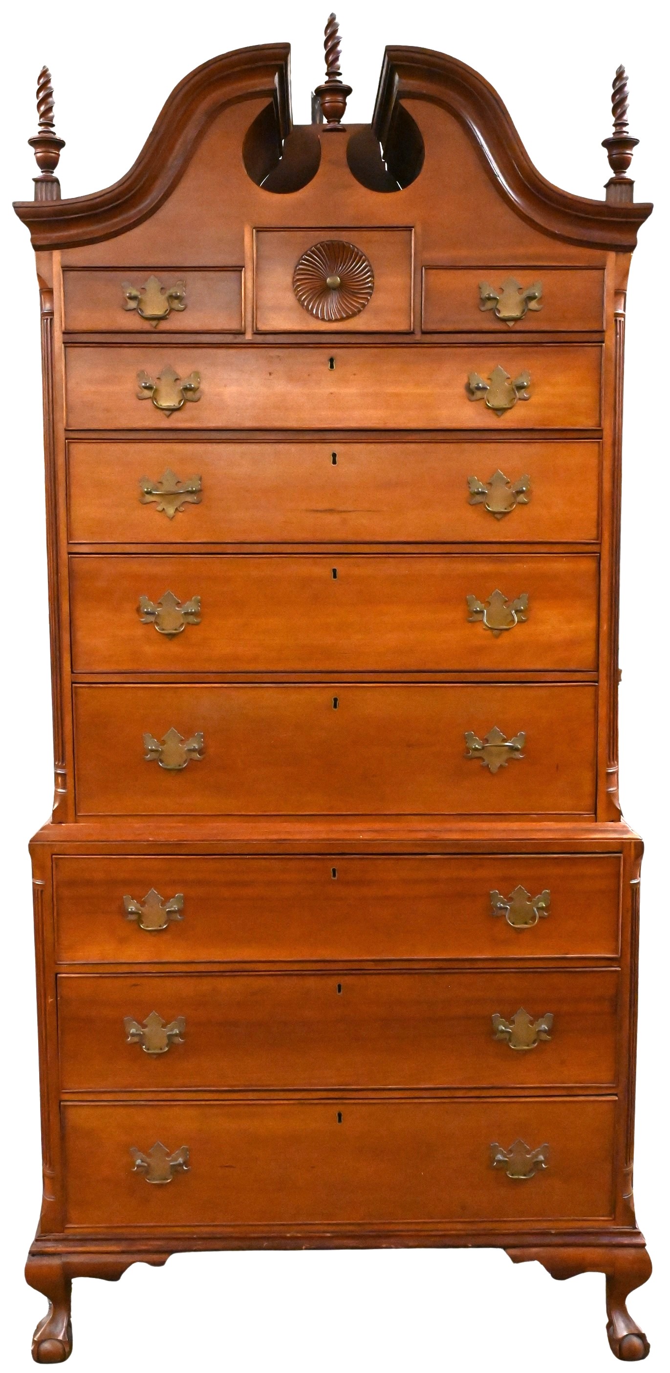 in two parts upper portion having bonnet top, three over four drawers on lower section with three drawers all flanked by fluted quarter columns set on carved ball and claw feet, old label in drawer, this chest was likely made by Nathan Booth of Woodbury CT circa 1760, it was owned for many years by Bronson and Bardsley Families September 20, 1994, it was owned by Marion Peck Coffill of Hartford