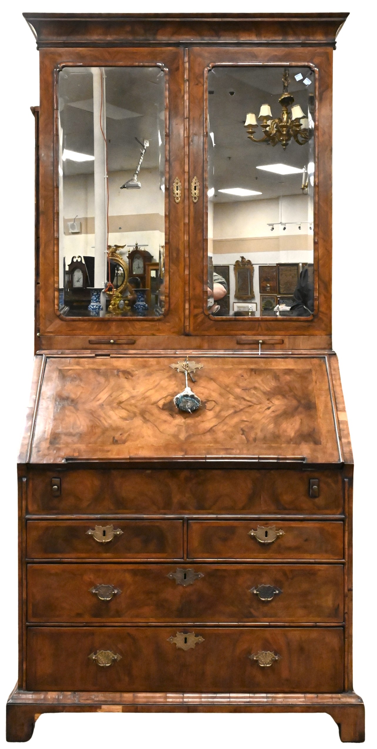 in two parts, upper section having two beveled mirrored doors opening to shelves on lower section with slant lid over two over two drawers on bracket base, interior drawers and well England, circa 1750, small chips, backboards replaced