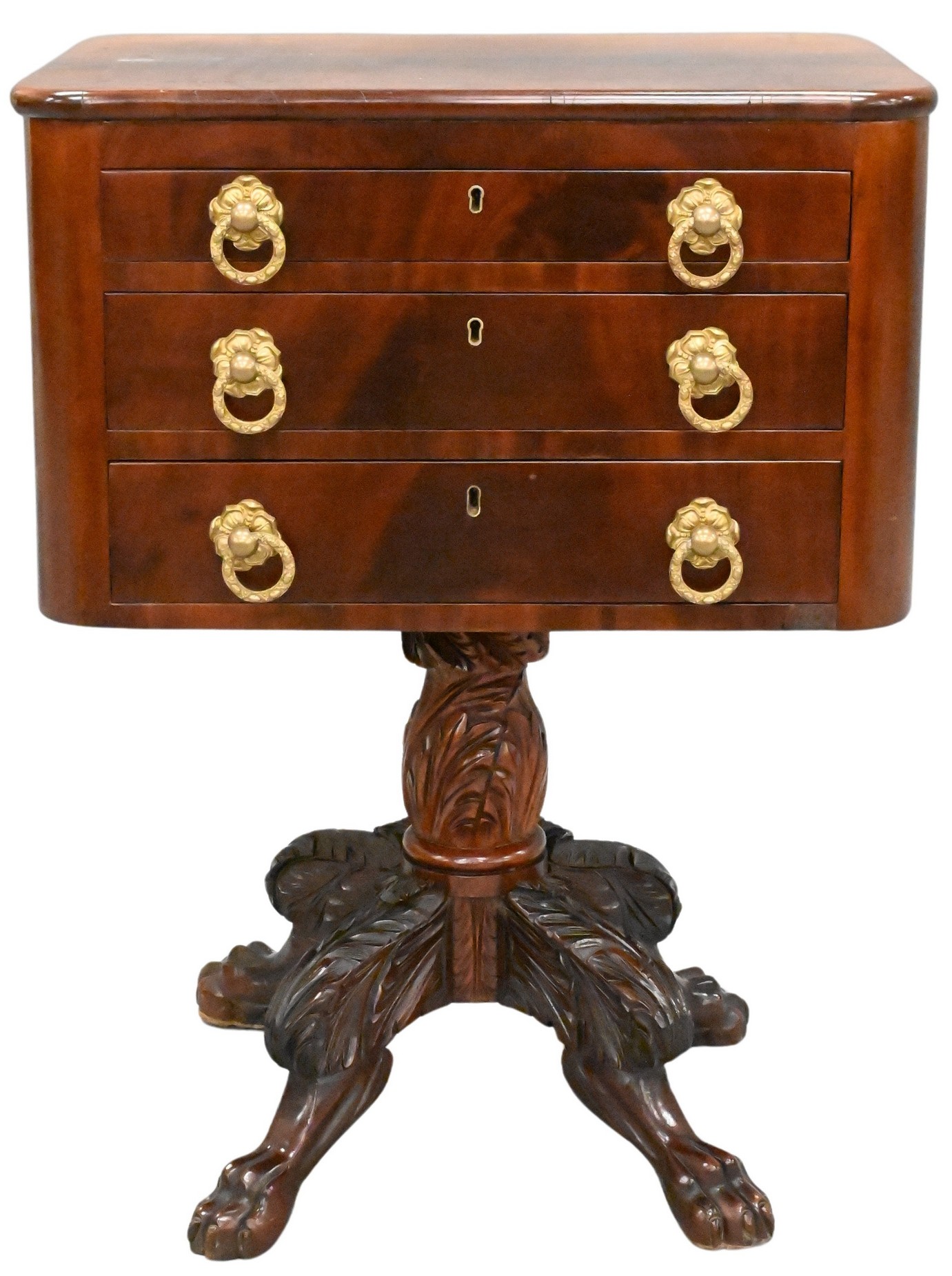 having carved pedestal and paw feet, drawer pulls are embossed brass, circa 1820