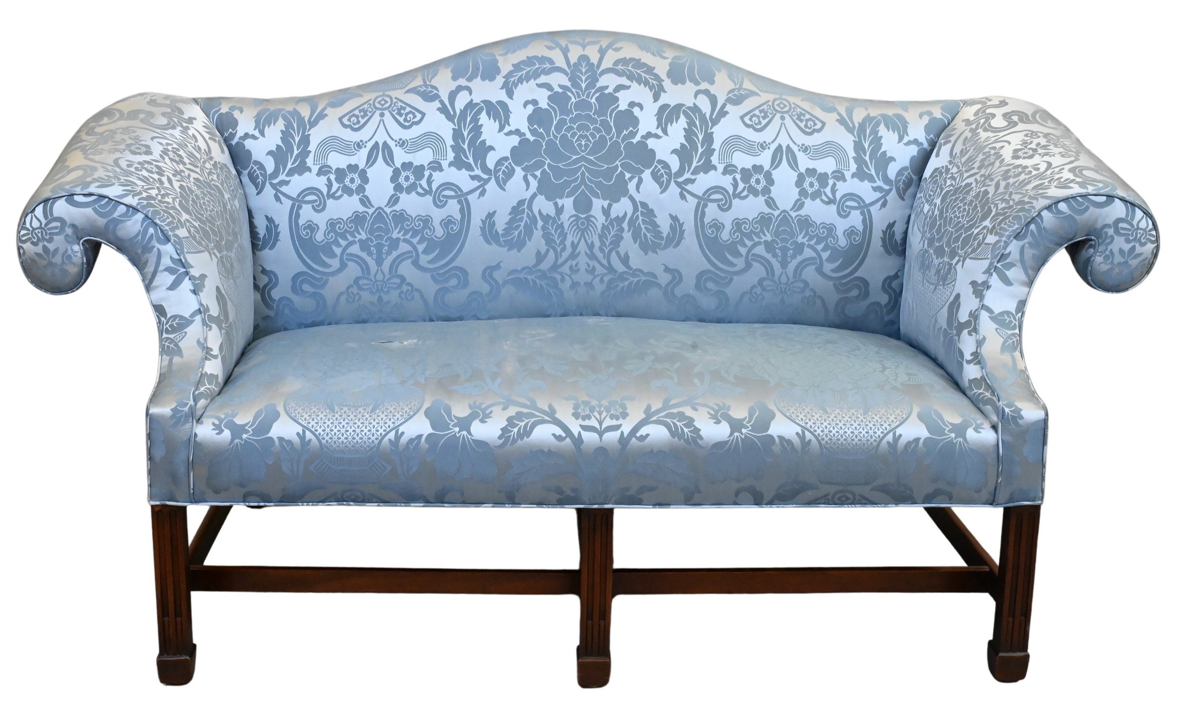 in light blue floral upholstery, mahogany frame, slight tears to upholstery