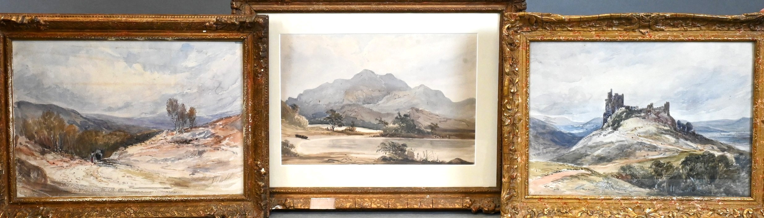 to include one depicting castle ruins on a hill, one depicting a man and woman with a horse in a Tuscan style landscape, the other depicting a mountain landscape beside the water with a row boat