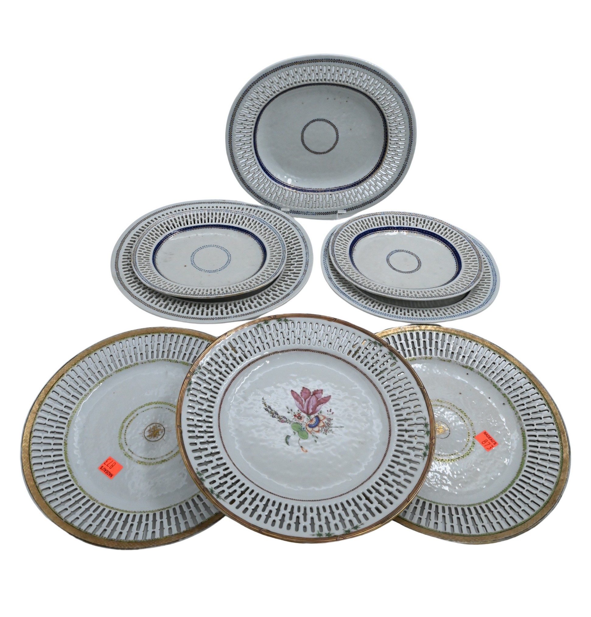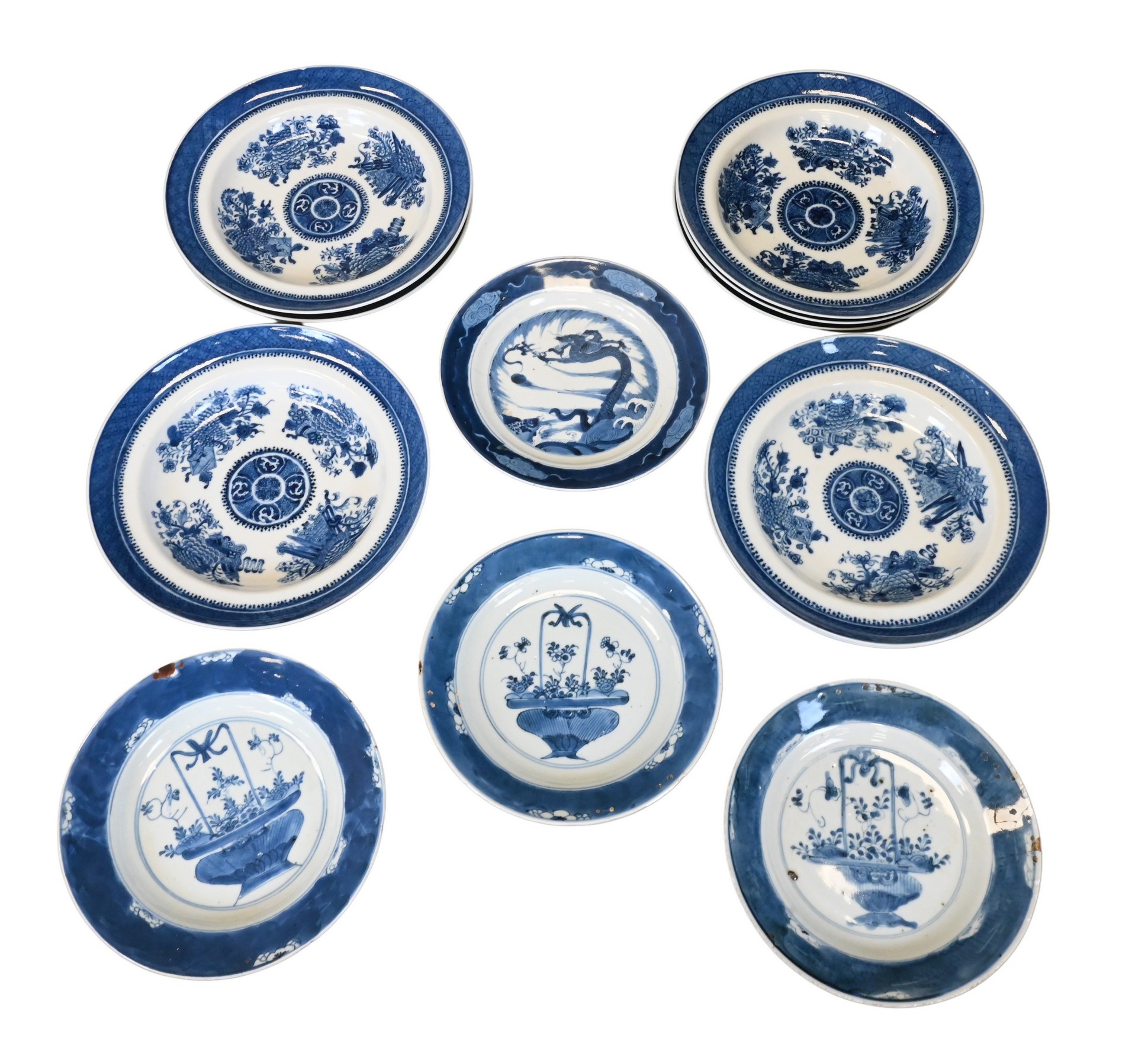 to include set of eight Chinese export Nan King deep plates, four Canton deep plates, baskets of flowers, white round dragon amongst waves plate, two stapled rim chips, small rim chips to three of the Nan Kings