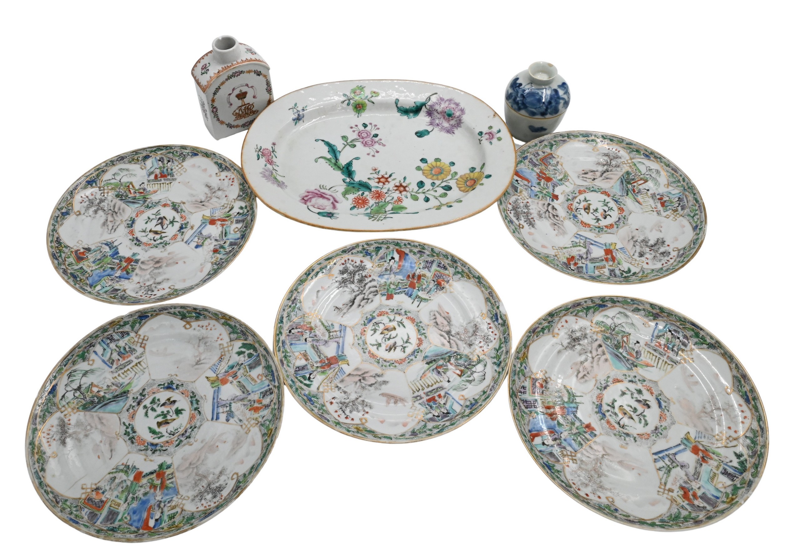 set of five Chinese Famille Verte porcelain plates each having high relief border, center medallion featuring birds in tree branches surrounded by gilt petal form cartouches depicting garden scenes with figures and landscapes, export tea caddy having gilt and floral wreath centered by crown and hand, small blue and white covered jar, along with export Famille Rose oval platter