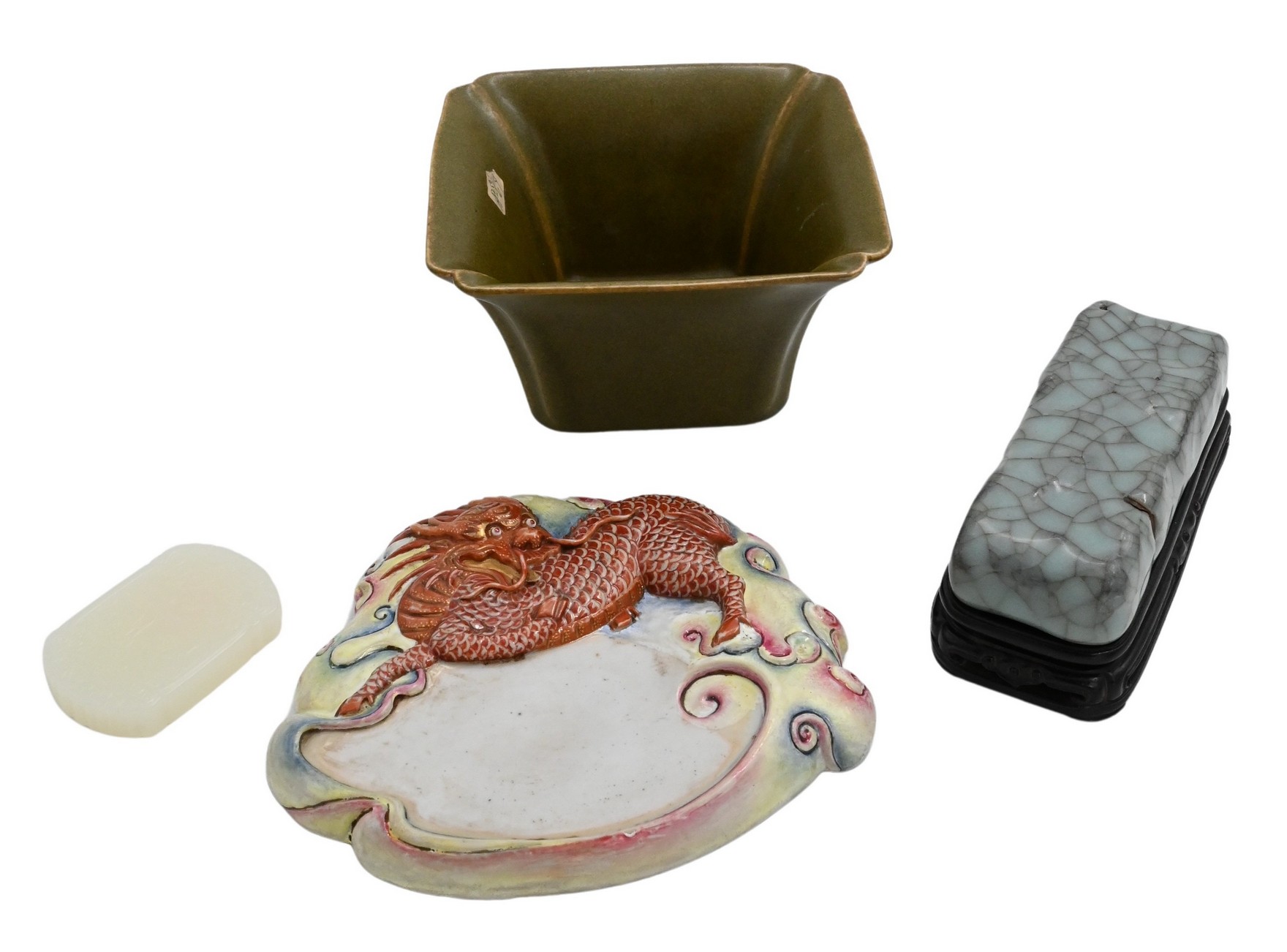 to include dragon form ceramic brush / ink washer having character mark and old label, small white carved hardstone pendant, tapering square tea green bowl with character marks and Ralph M. Chait Galleries New York label, along with blue crackle glaze rectangular brush rest on carved base
