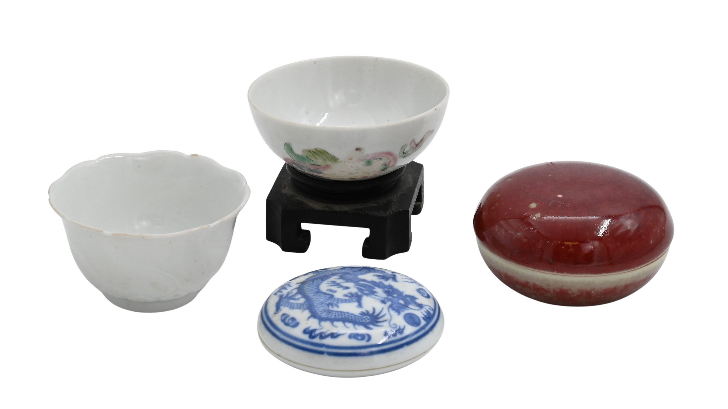 to include round Famille Rose erotica cup mounted on wooden base having blue character mark, white glazed lotus teacup having petal like lobes and six character marks to base, blue and white dragon seal paste box, round peach blossom seal box