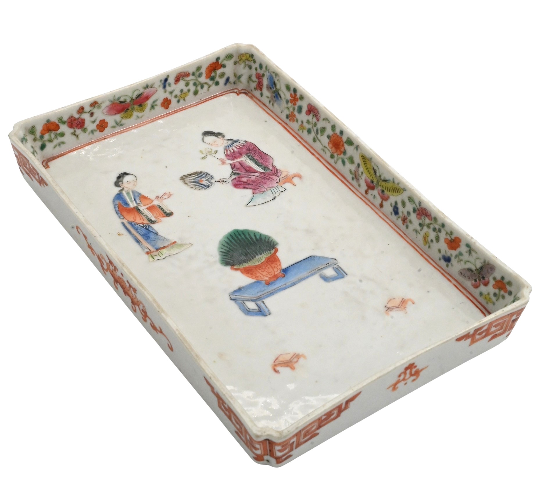 of rectangular form raised on four shaped feet, center depicting two Geishas, one woman with fan, the other bowing beside a potted plant on a bench bordered by butterfly and flower motif, exterior geometric design in iron red