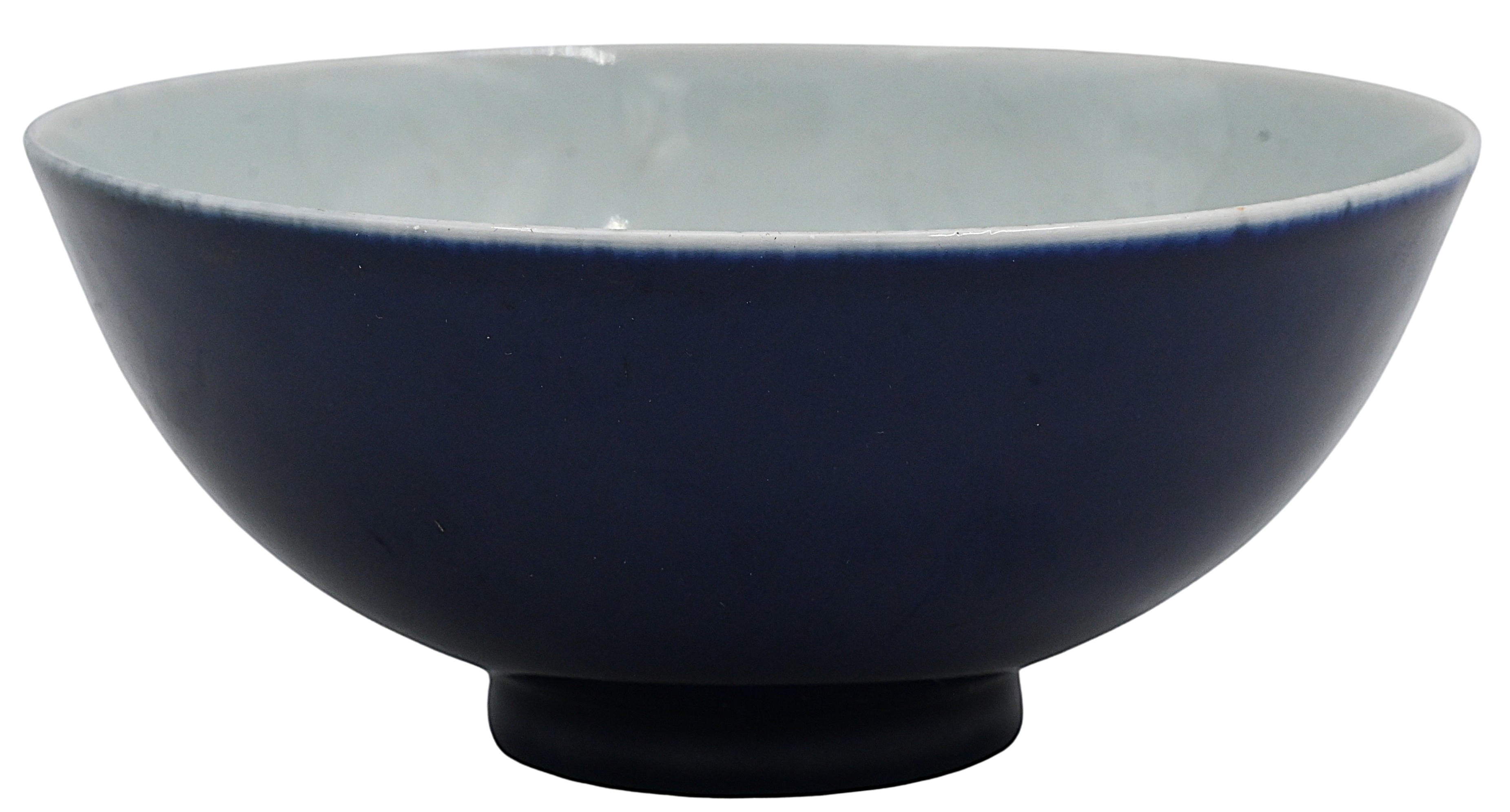 having round sides coming to slightly flared rim set on small round footed base, blue exterior glaze transitioning to light blue / white interior and underside, six character marks within double circle