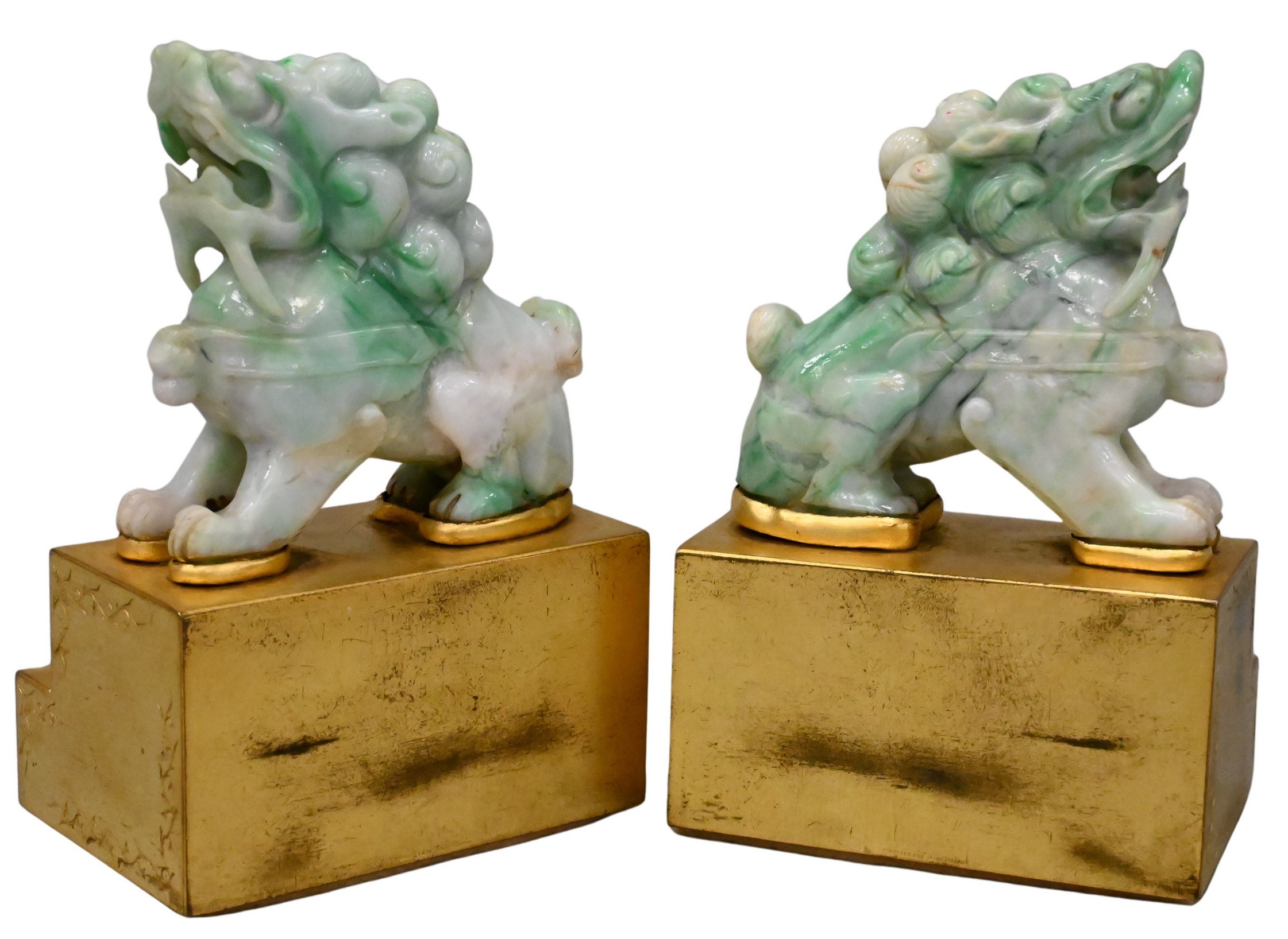 green and white carved stone featuring swirling manes, open mouths, in a sitting position, mounted on gilt metal pedestal base
