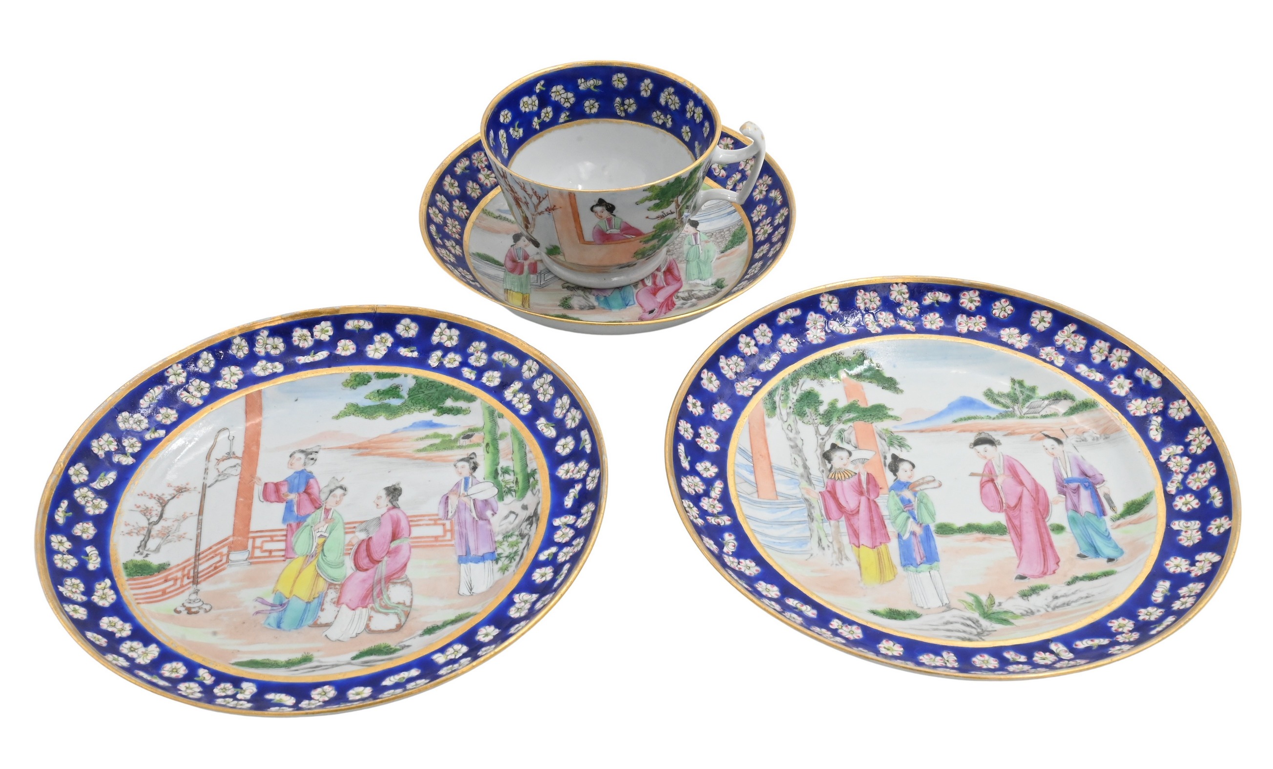 to include one teacup, 13 small dishes, 12 plates, each having center motif of scholars, women, and courtyard scenes surrounded by cobalt blue and gilt floral rim, 18th century some chipping and loss