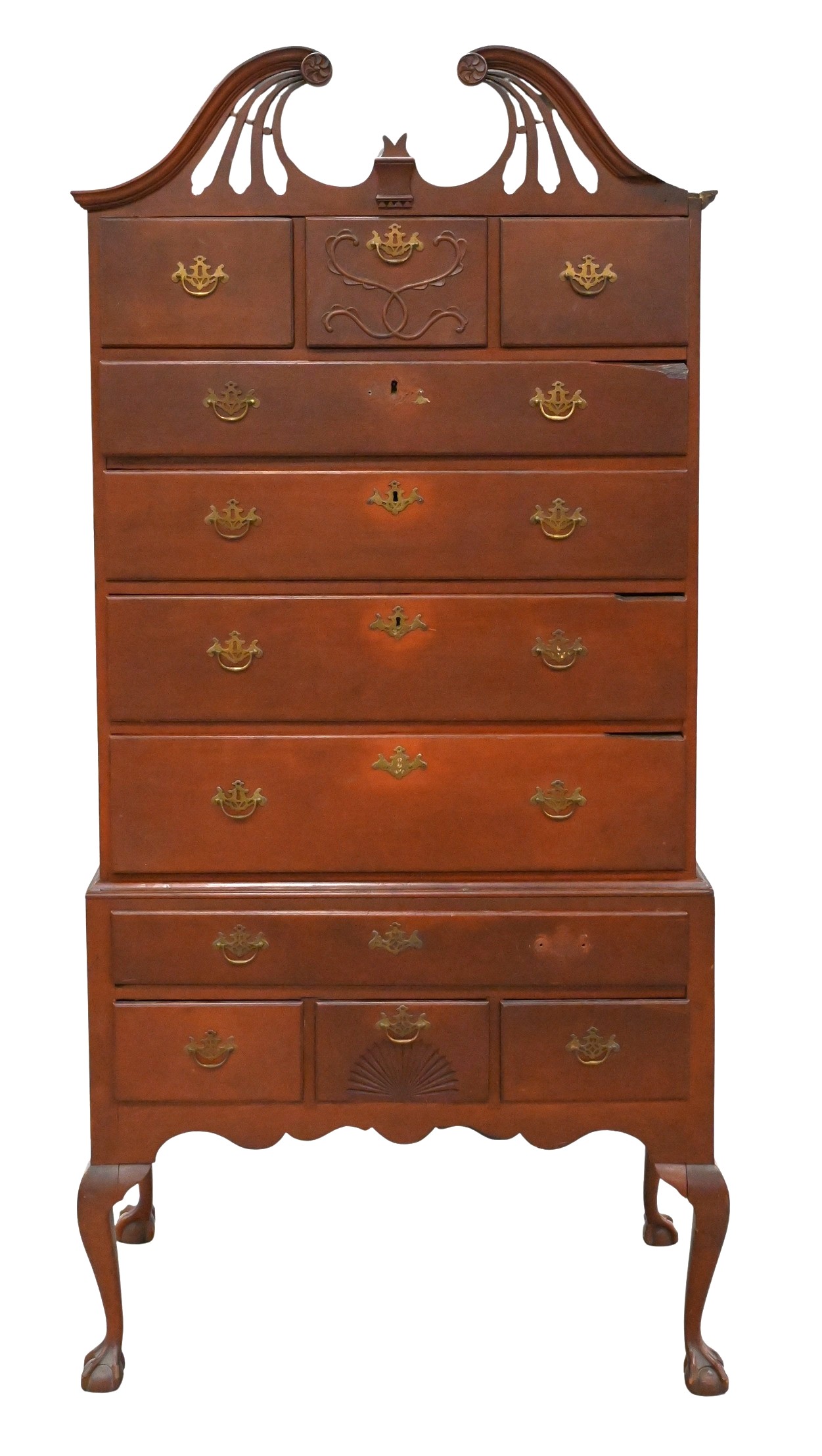 in two parts, upper section having pierced carved broken pediment and top having small center carving over three drawers the center one having vine and rosettes carving over four graduated drawers on lower section with one long drawer over three short drawers having center fan carving over scalloped apron all set on cabriole legs ending in ball and claw feet, original hardware and old red finish, circa 1780 Connecticut River Valley, cherry and Eastern white pine