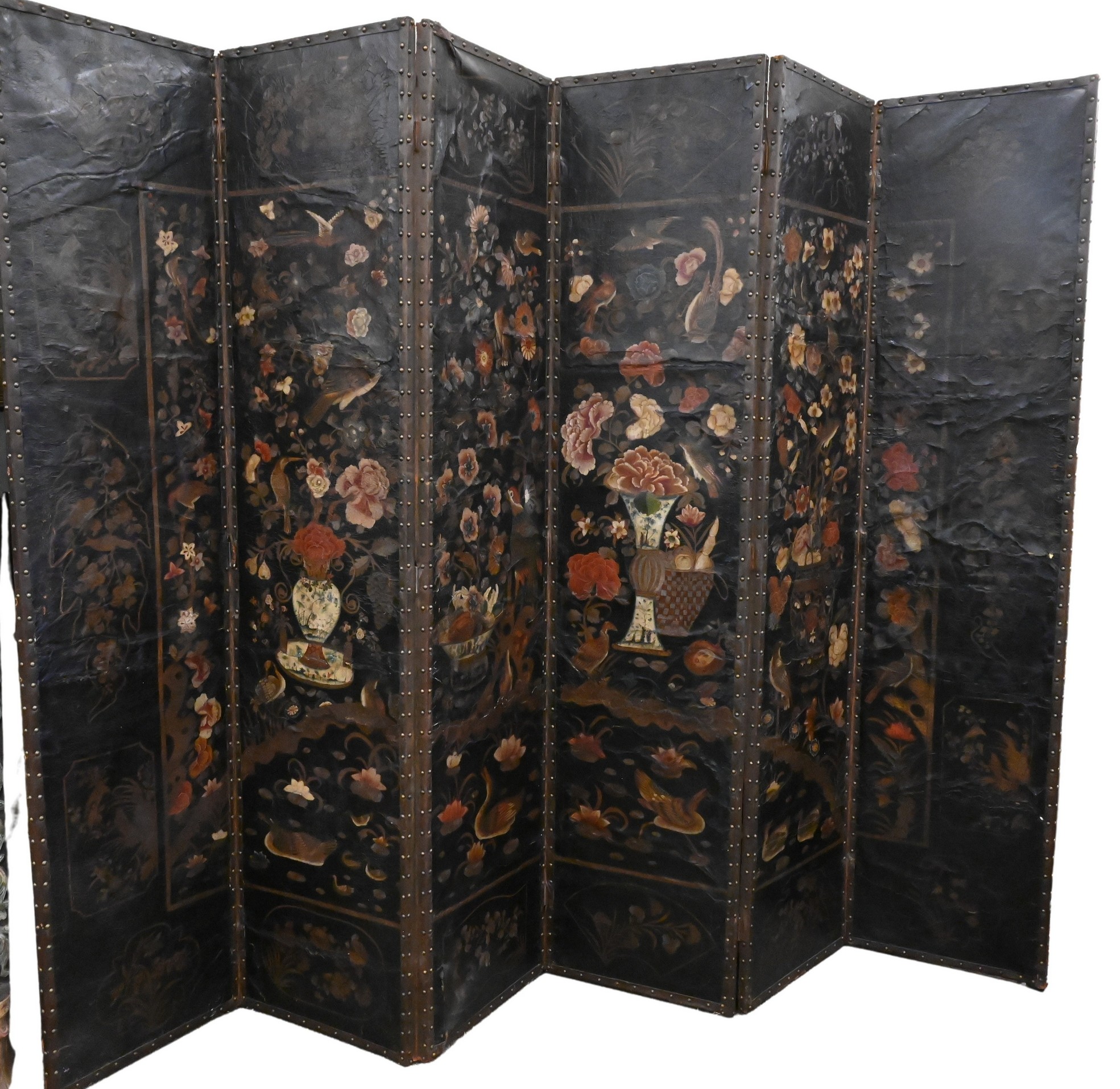 Six Panel Continental Chinoiserie Painted Leather Screen