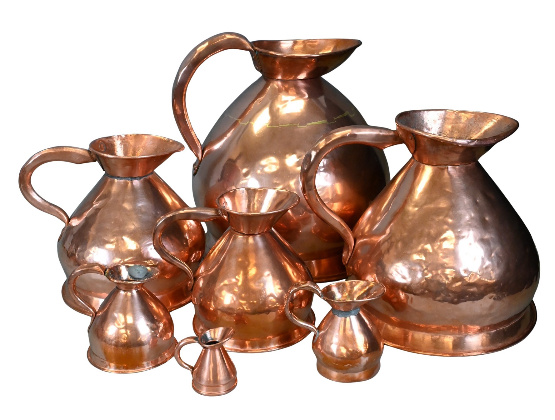 Set of Seven English Graduated Copper Measuring Jugs or “Haystacks”