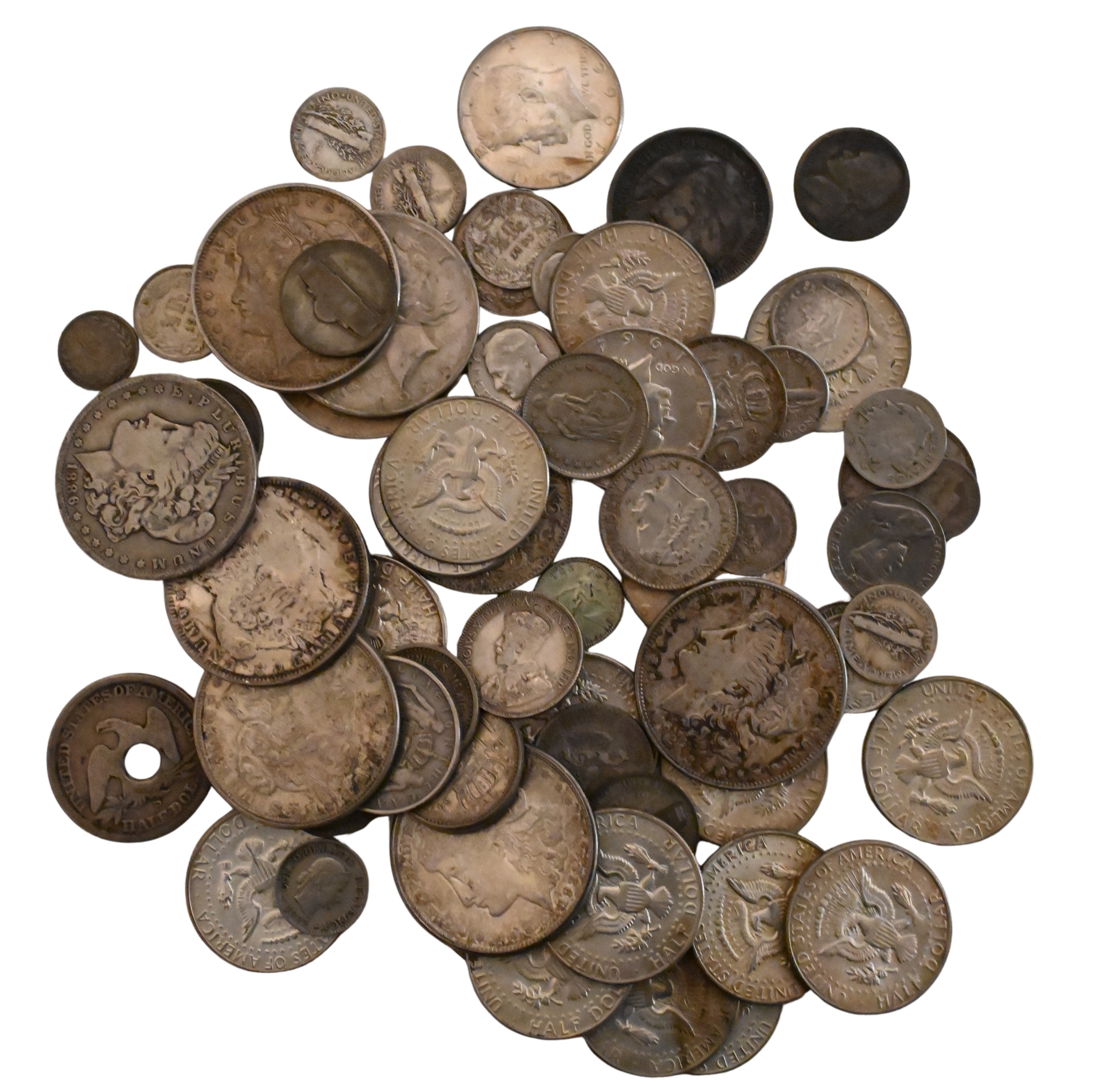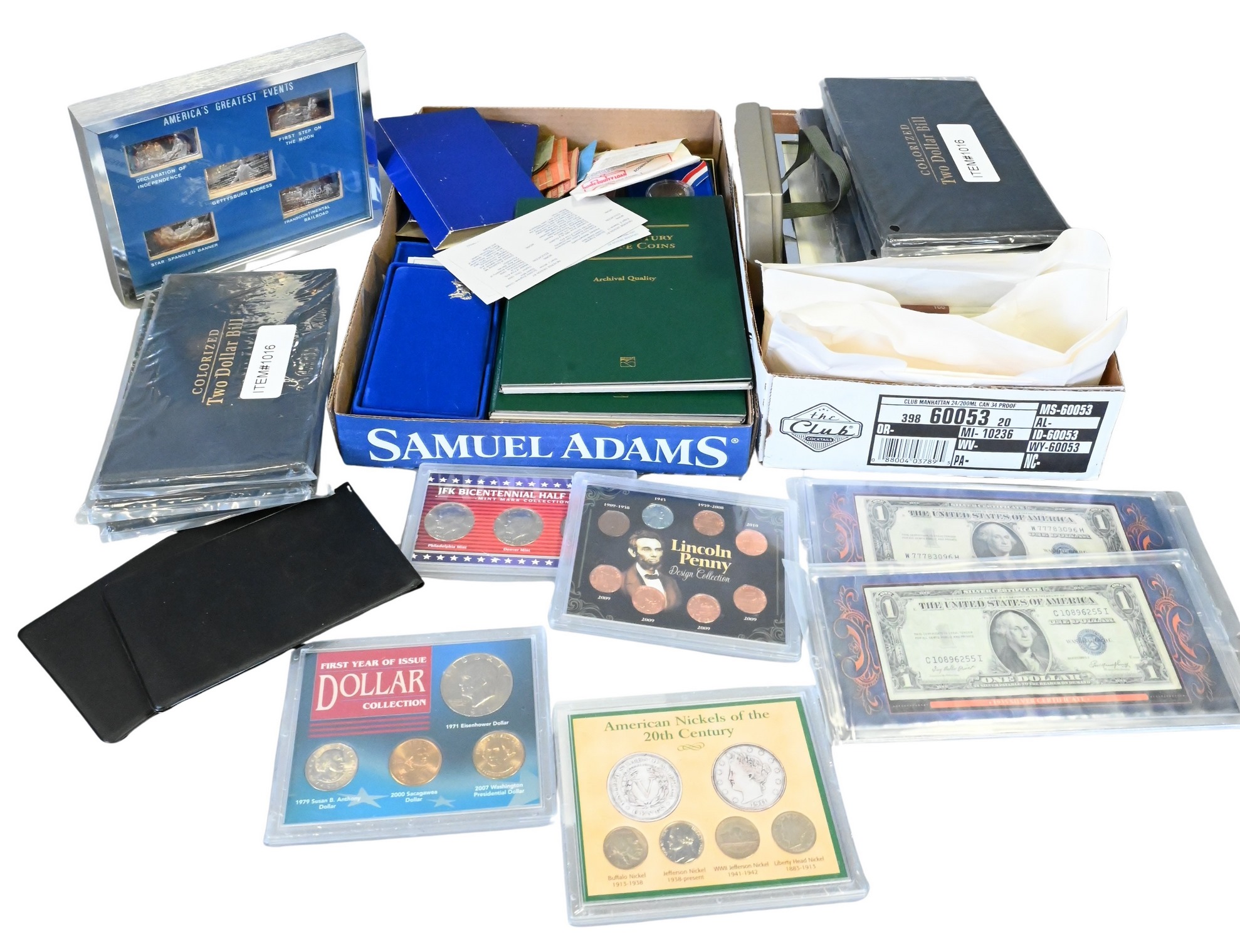 to include three $1 silver coins, one half dollar silver coin, partial book of 20 2007 Presidential dollars, partial book of state quarter dollars, Morgan silver dollars, Susan B. Anthony dollars, eight colorized $2 bills unopened, five silver bars America’s Greatest events, $100 in $2 bills new in numerical order, fifty $1 new bills in numerical order, and miscellaneous coins
