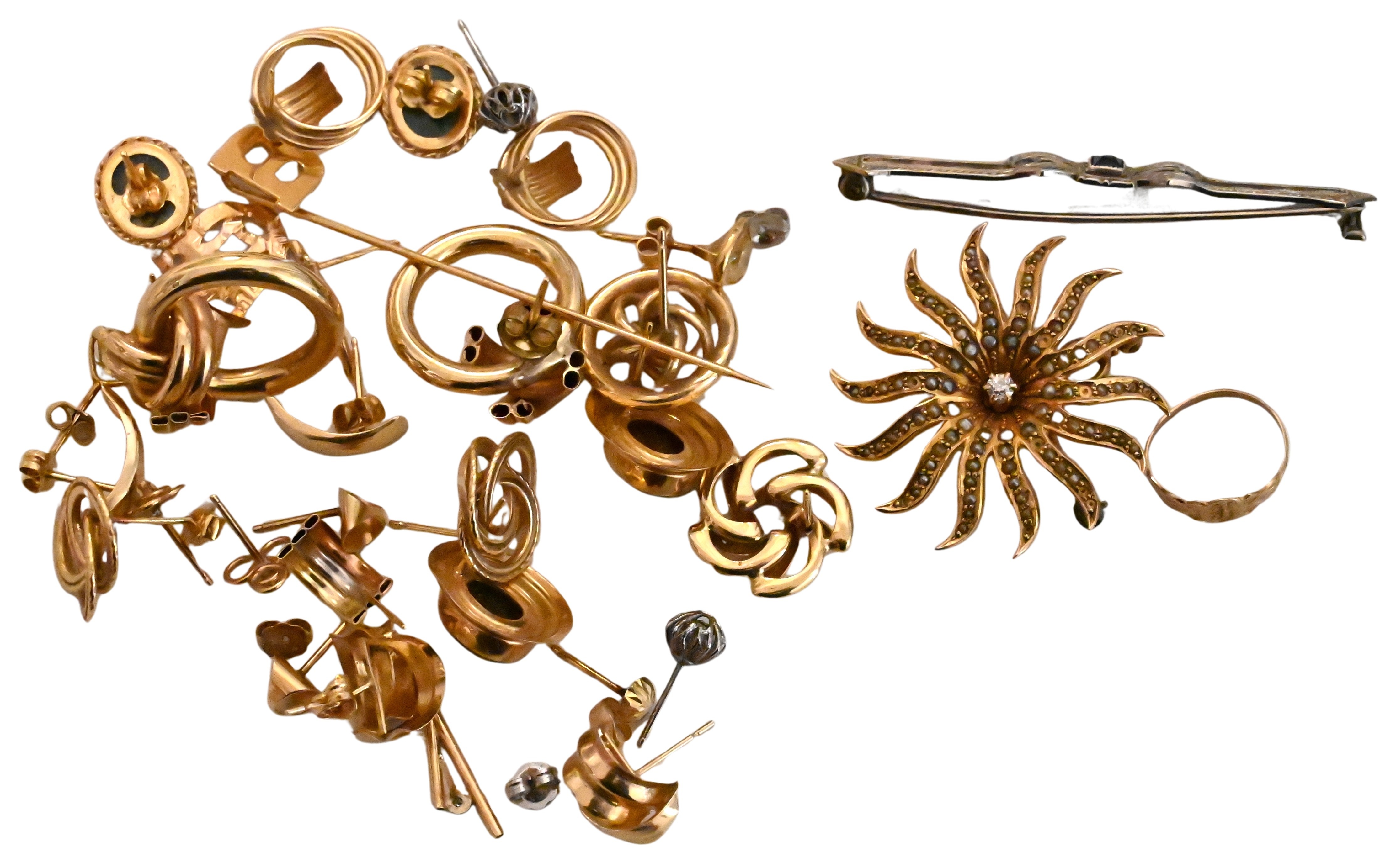 to include 18K ring with hearts, 14K ring having enamel, pair of earrings, single stud, locket pendant with pearls, and clask having purple stone