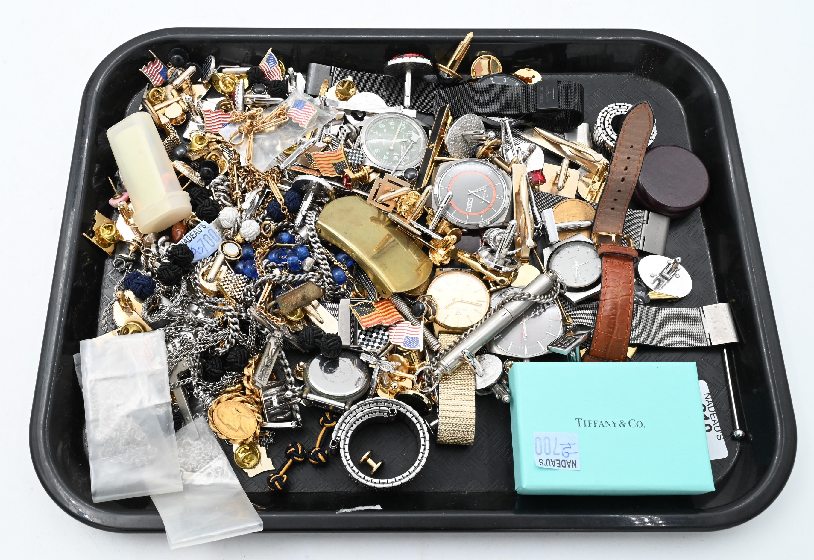 to include cufflinks, tie pins, clips, tacks, bracelets, necklaces, and watches, some sterling silver including Tiffany and Company sterling money clip