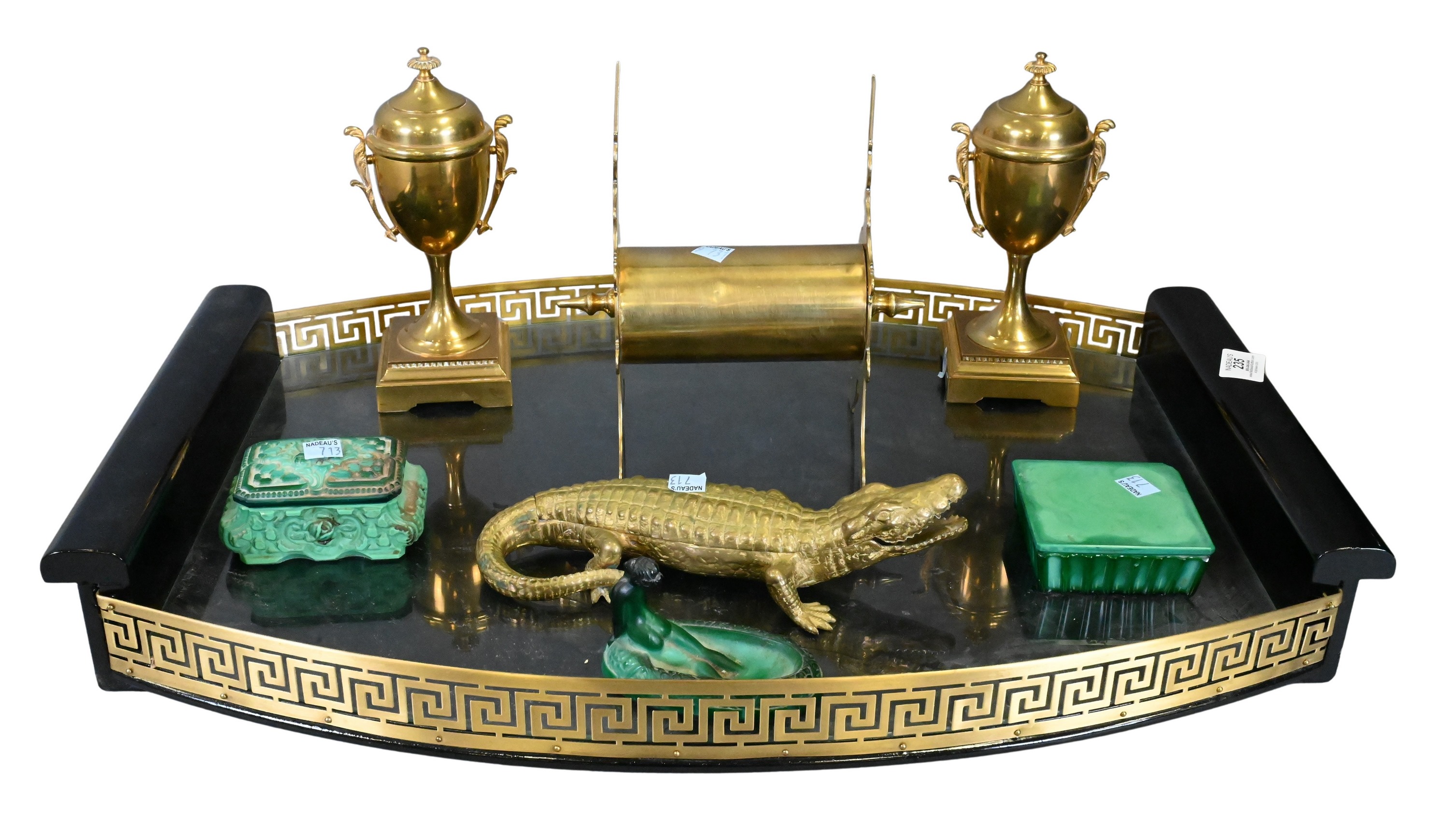 to include three Bohemian Art Deco Mauate green ink wells and boxes, dish one having figural nude, brass alligator / crocodile inkwell, brass cylinder coin bank, pair of small brass urns 19th century having old label on underside, and wood tray with Greek key brass