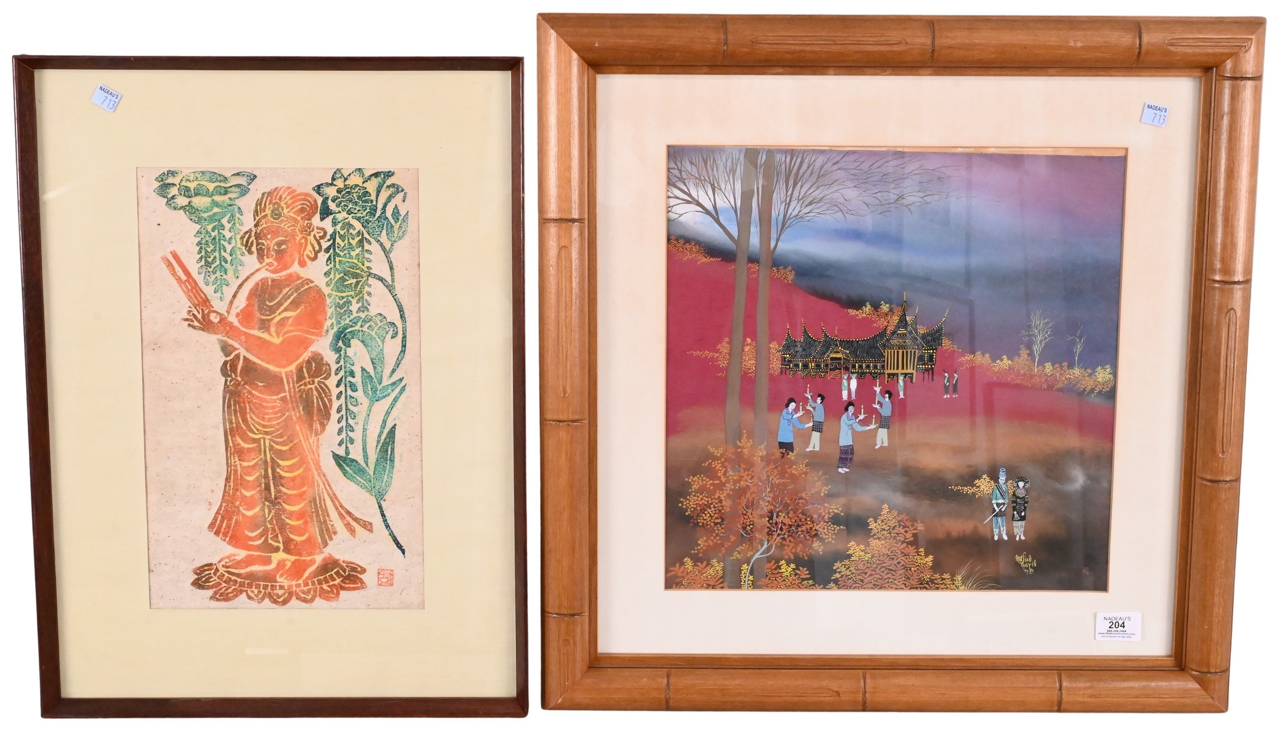 watercolors on silk of birds, flowers, geishas, woodblock reproduction of “The Wave” , Japanese watercolors of Xiangshan Kingdom, Buddha woodblocks etc…