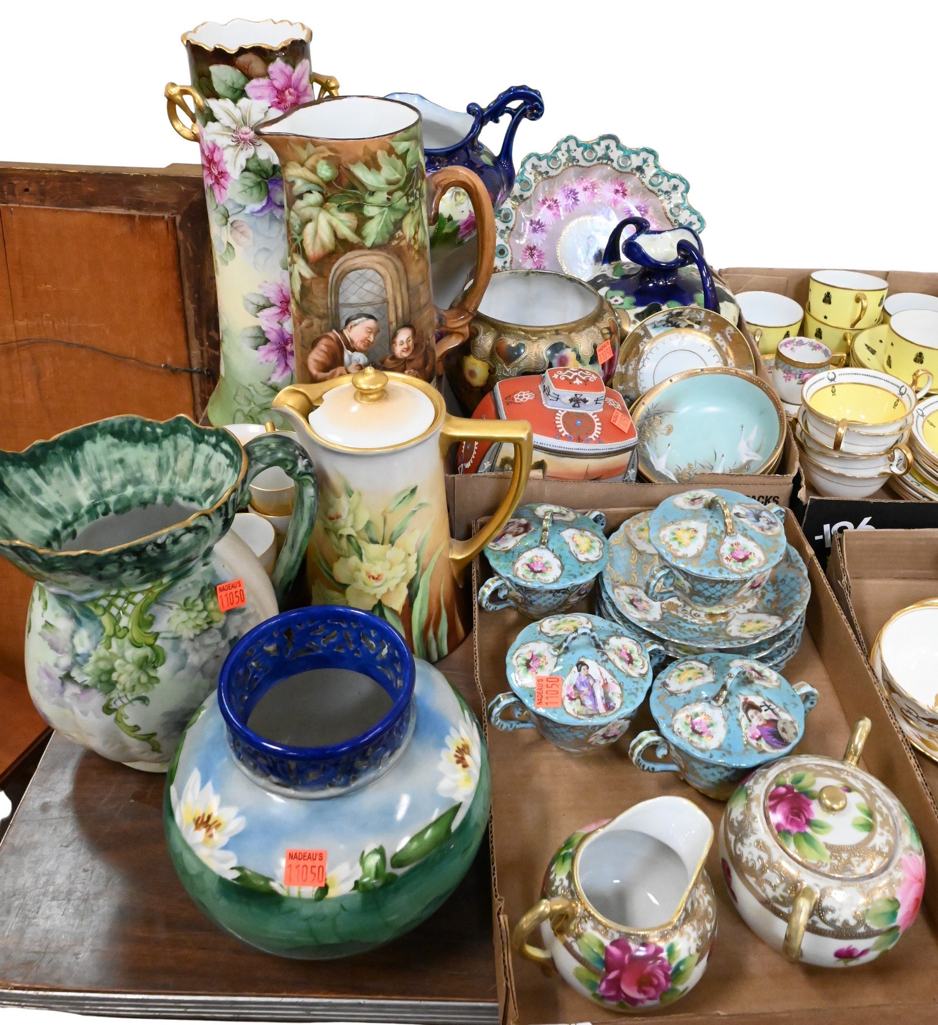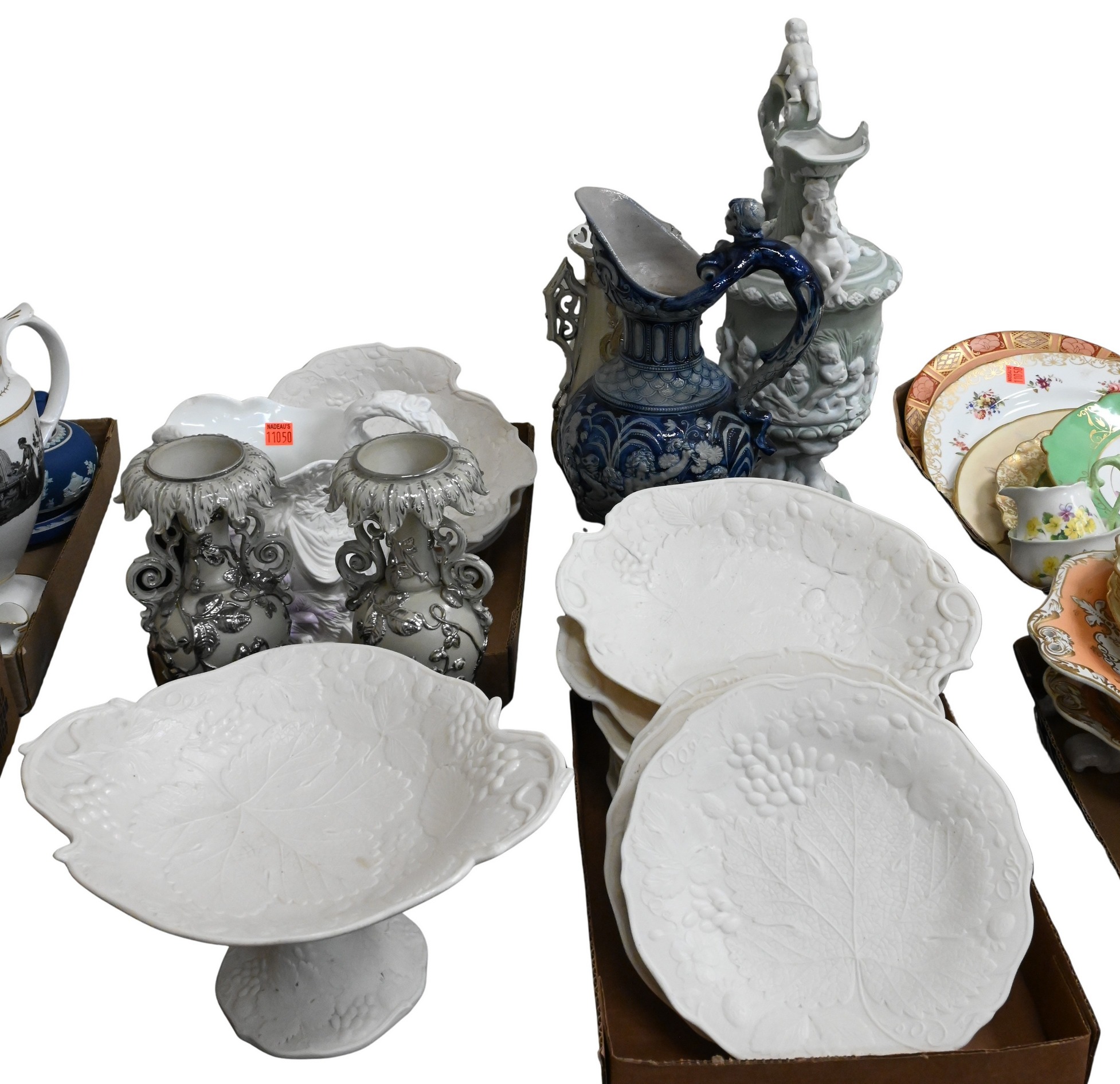 Ridgway ewer, green pitcher with putti, vases, plates with floral design etc…