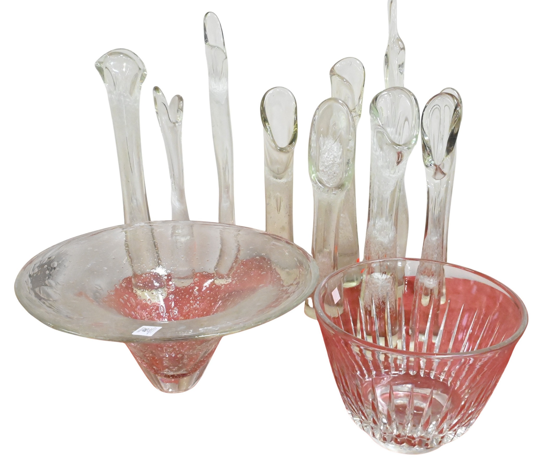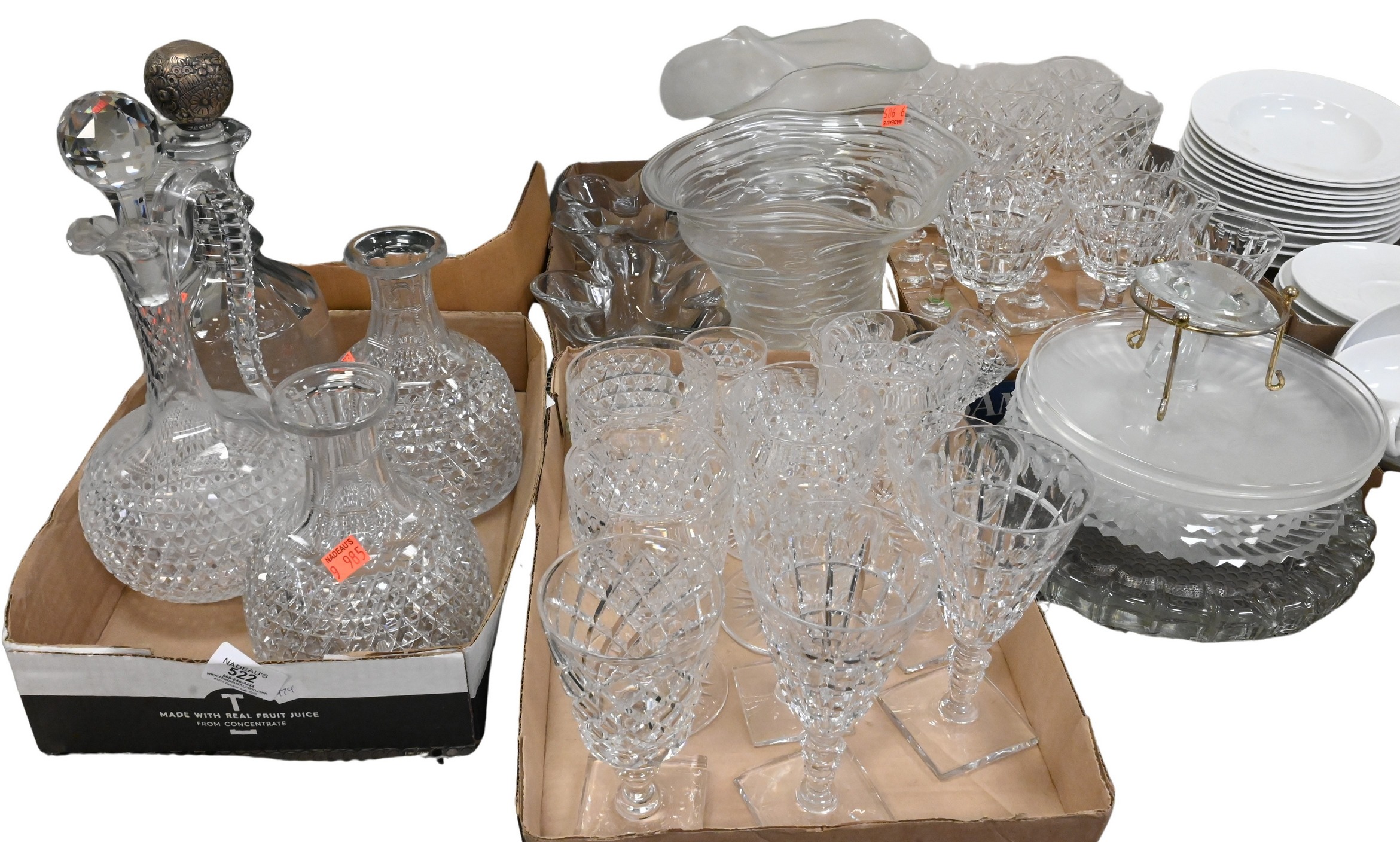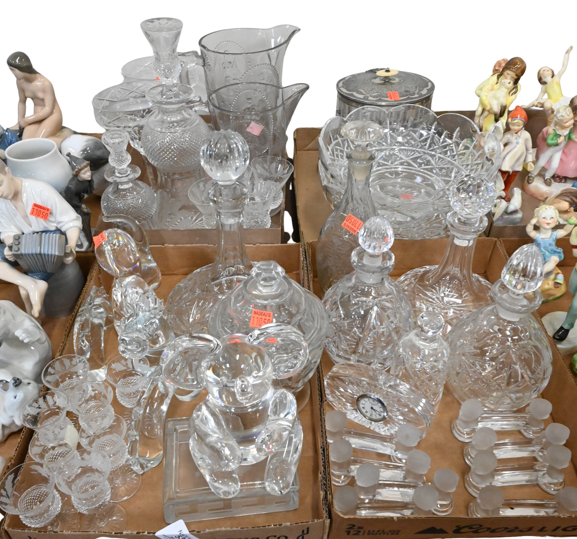 to include three Steuben glass animals, Koala bear, height 6 inches, squirrel and small penguin, cut glass decanters, pitcher, bowls, knife rests with putti heads, Waterford clock, etched glass cordials etc…