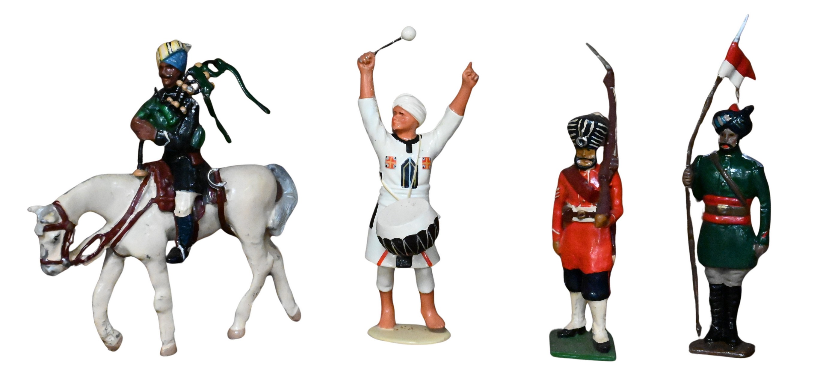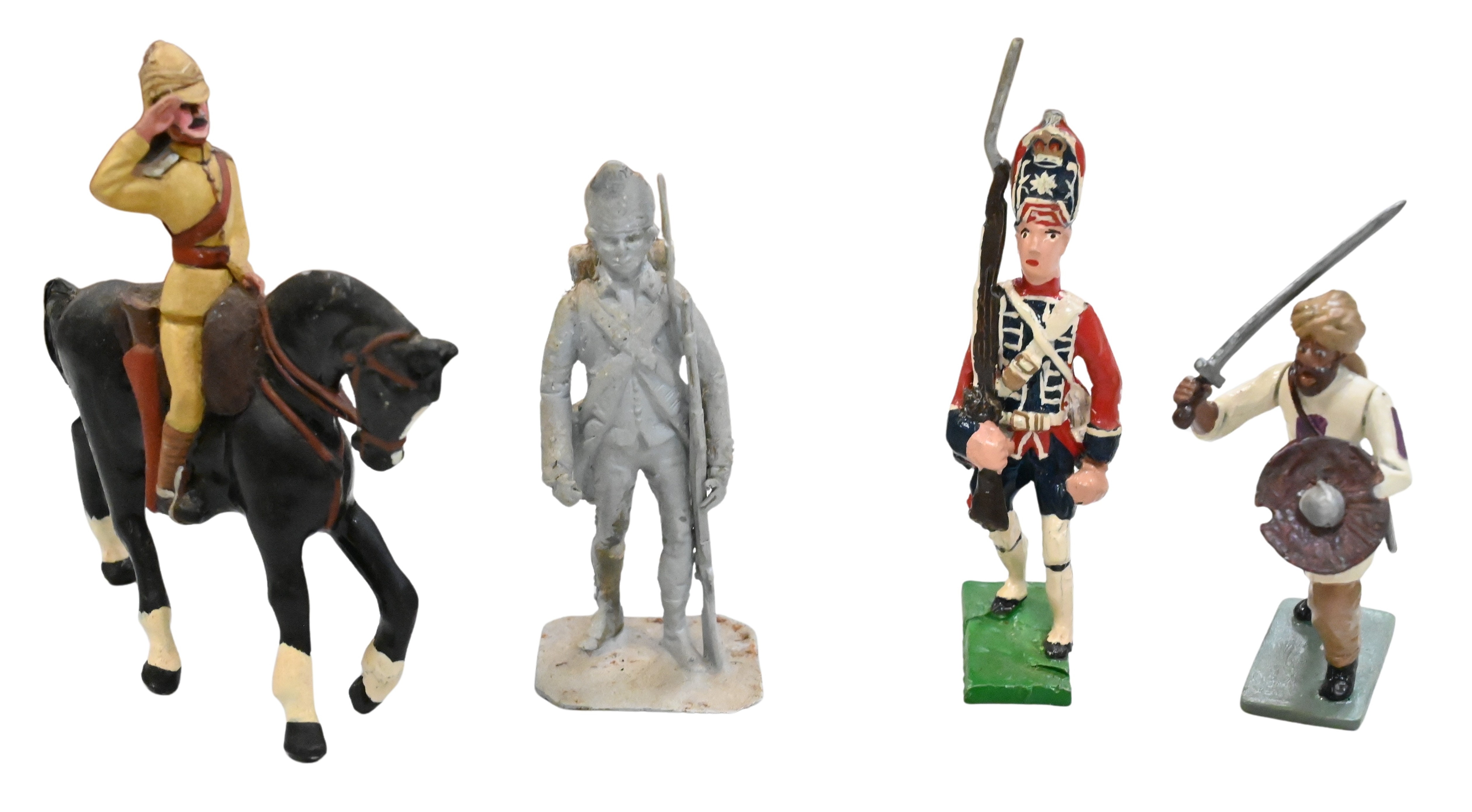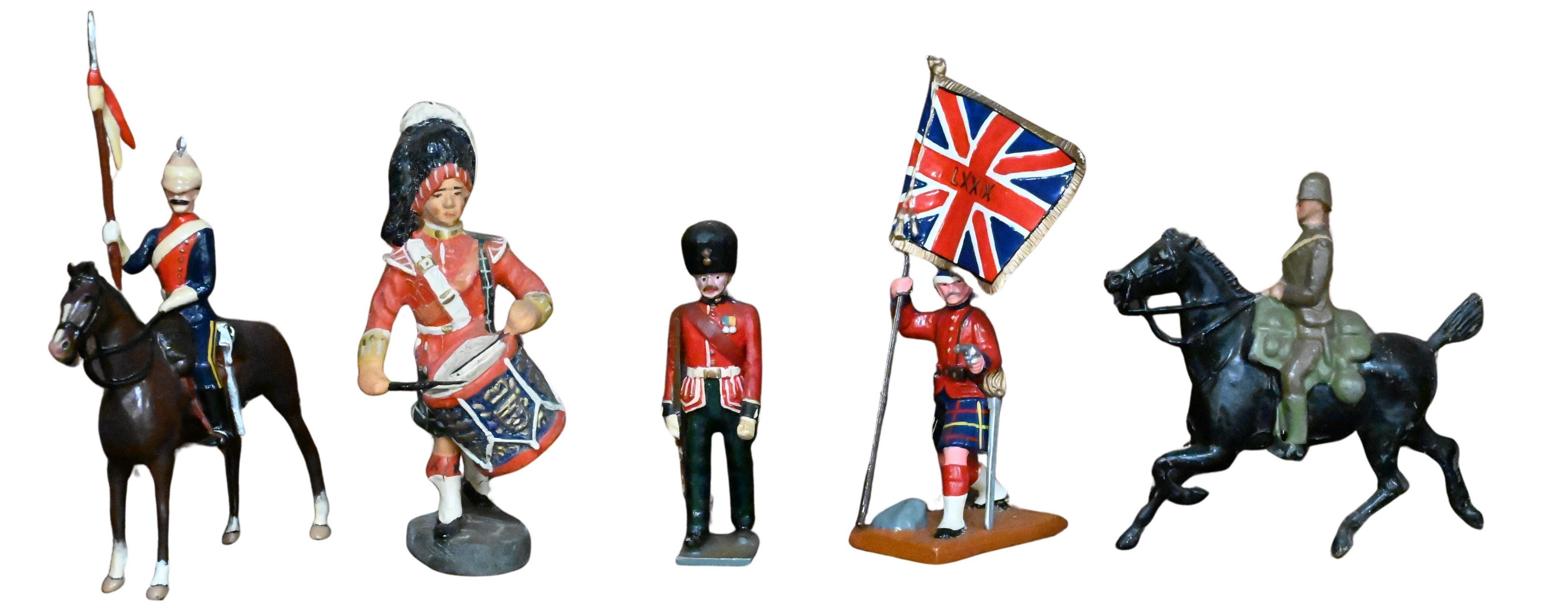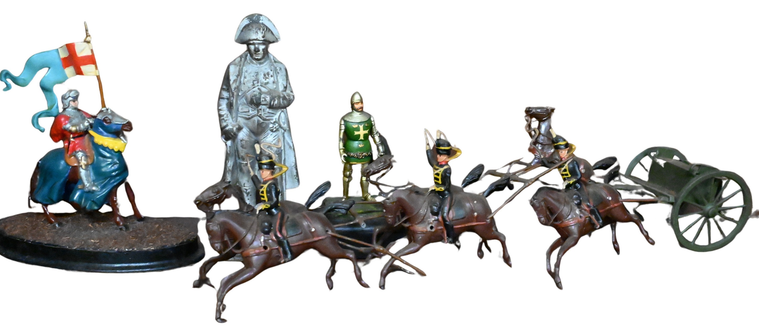 Cowboys and indians, carriages, trees, Scottish Highland soldiers, horses, cavalry, British soldiers, Queen’s guard soldiers, along with Sitzendorf porcelain Cameron Highlander 1814 etc…