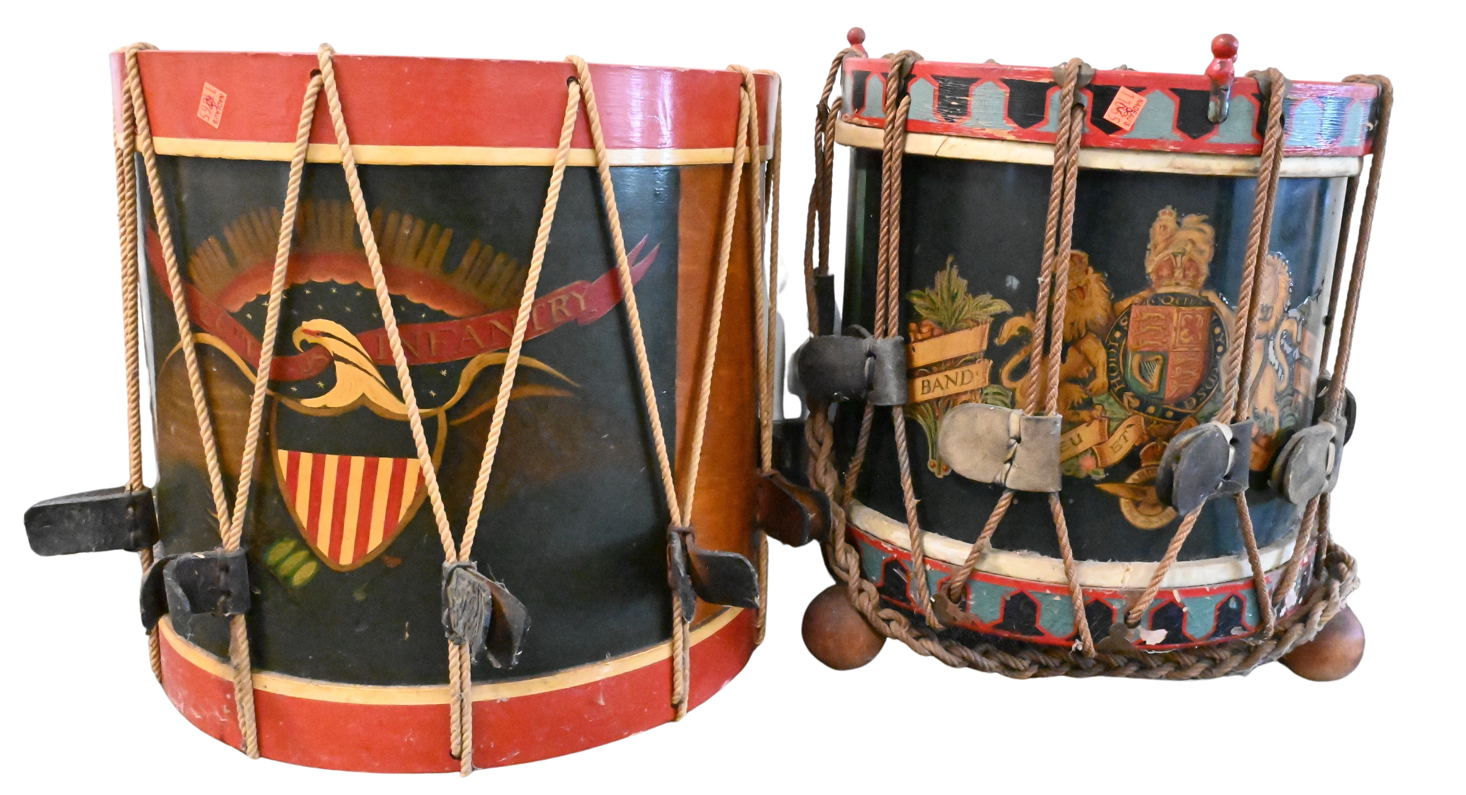 one a historic reproduction of a pre-Civil War 9th Regiment Infantry drum and the other a WWI era British Royal Airforce drum