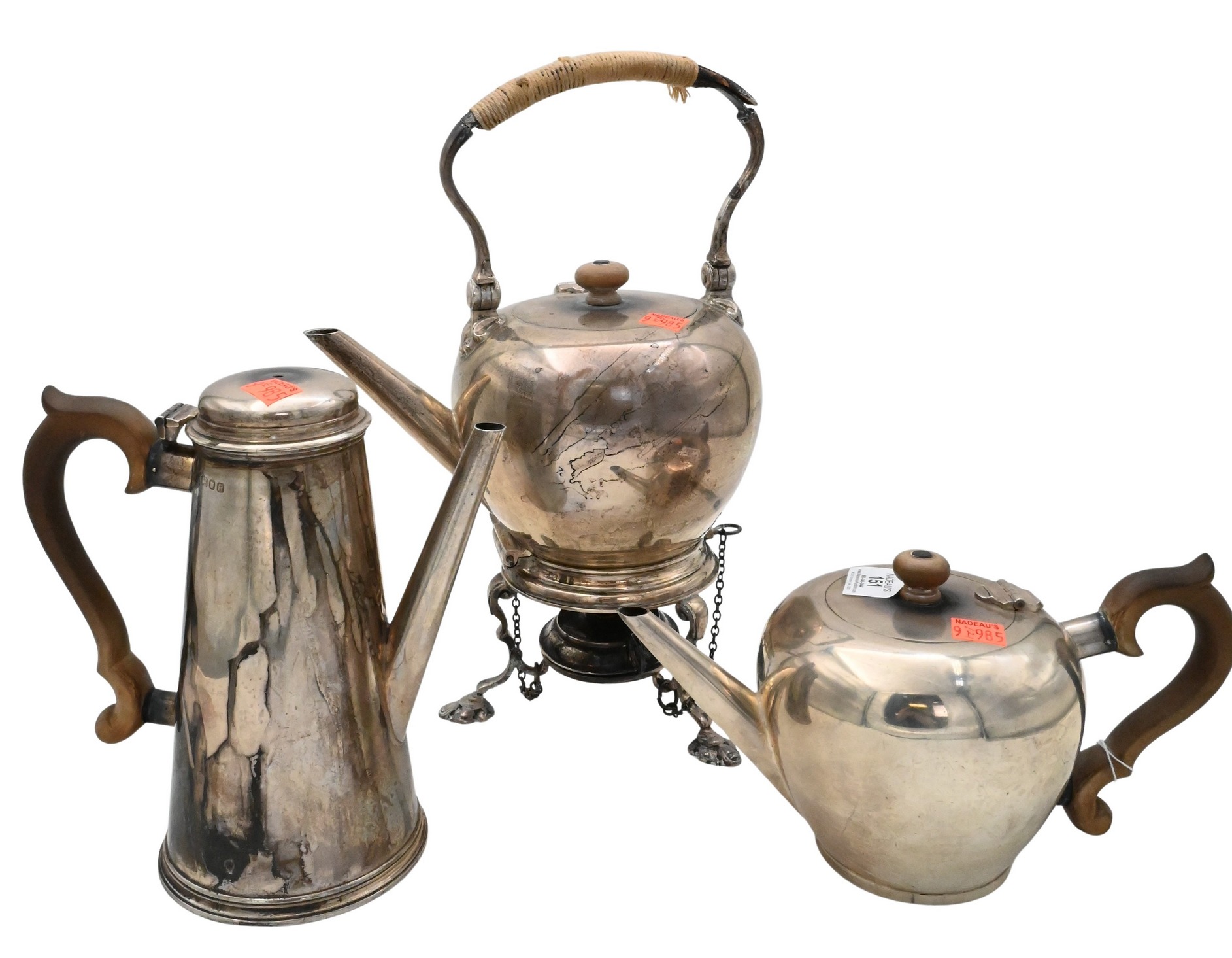 to include Queen Anne style teapot, Queen Anne style butter form water pot and burner/stand, and light haze form coffee pot missing finial, all marked “PG” after Peter Guille
