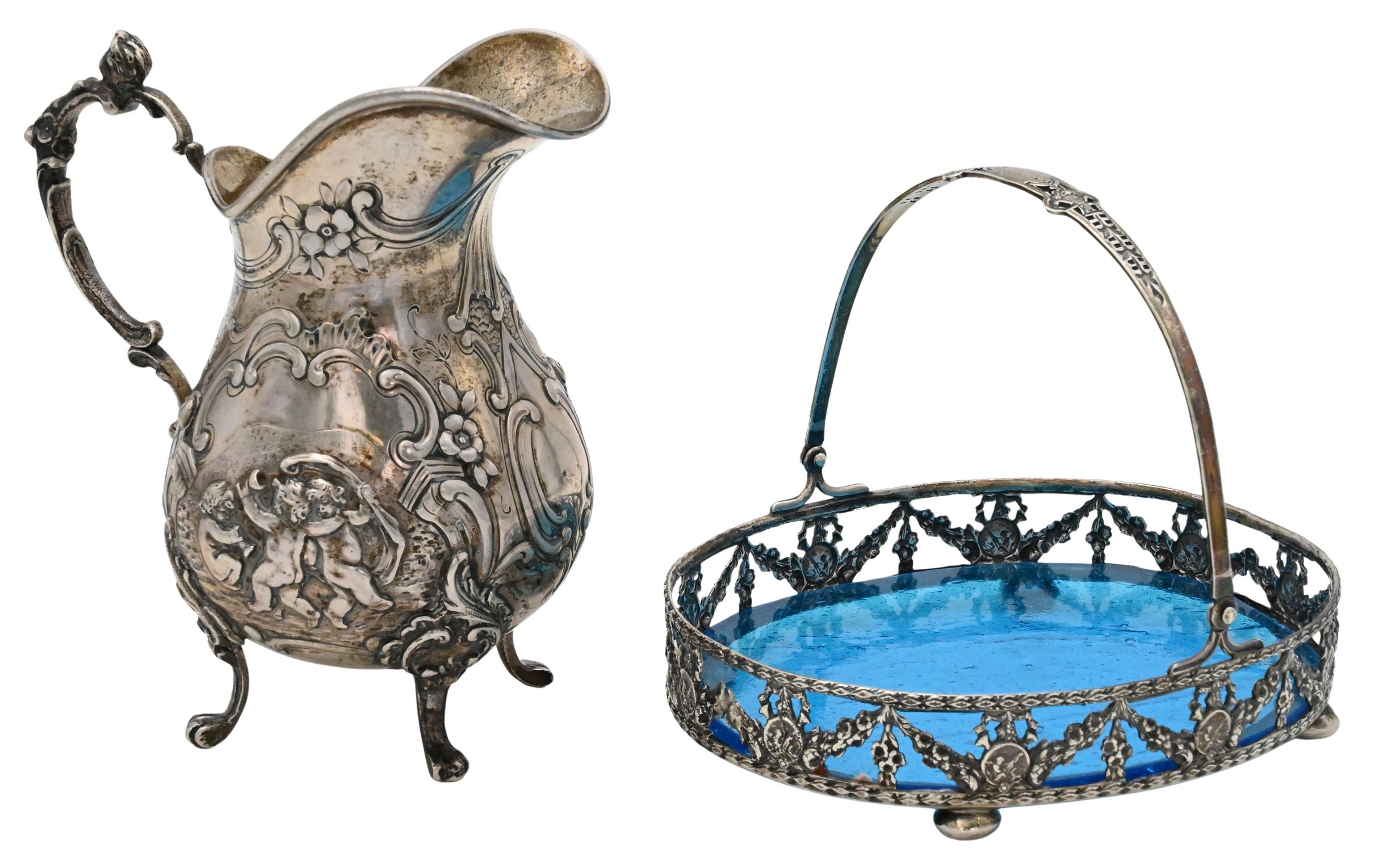 to include 800 silver repousse and chased pitcher, along with sterling silver and glass tray having handle