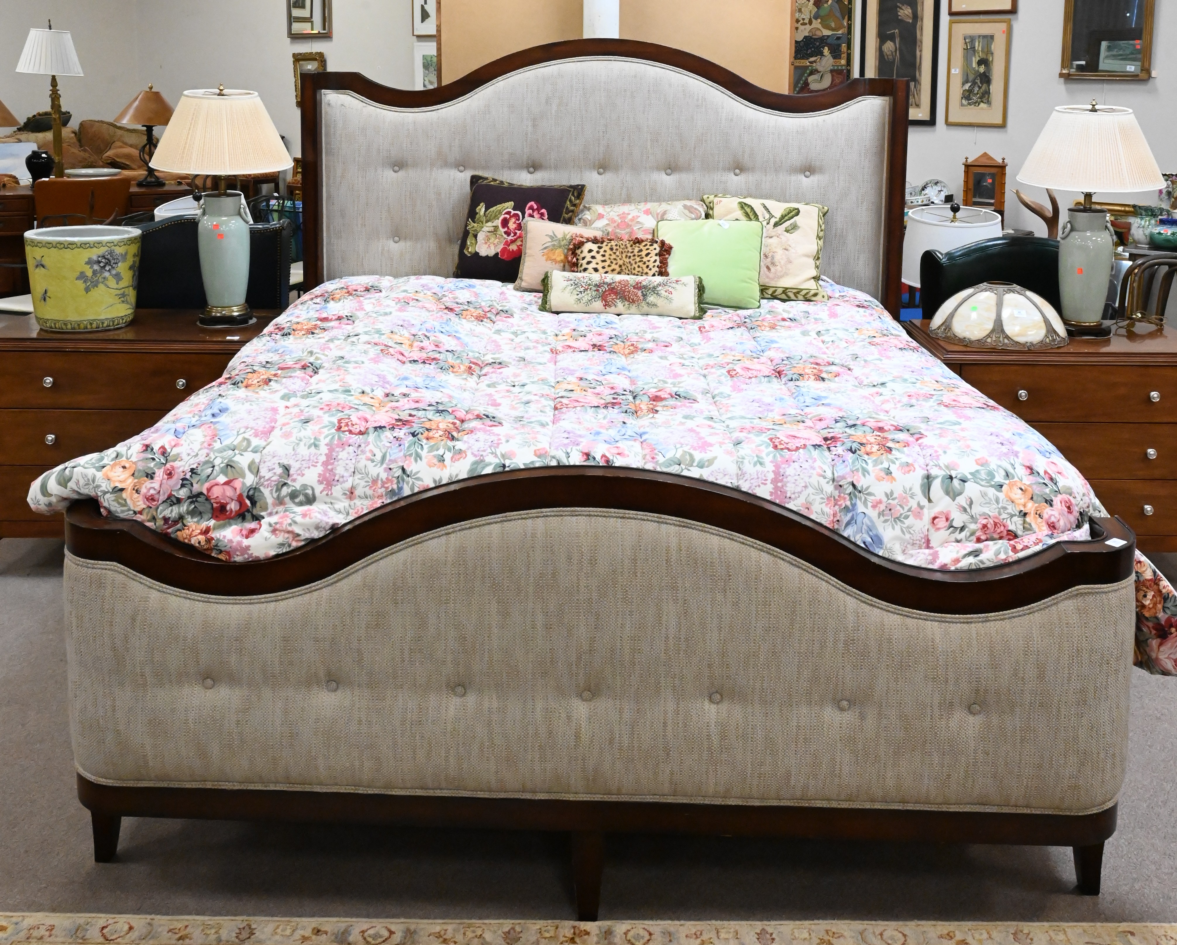 complete with mattress and box spring, upholstered headboard, and footboard