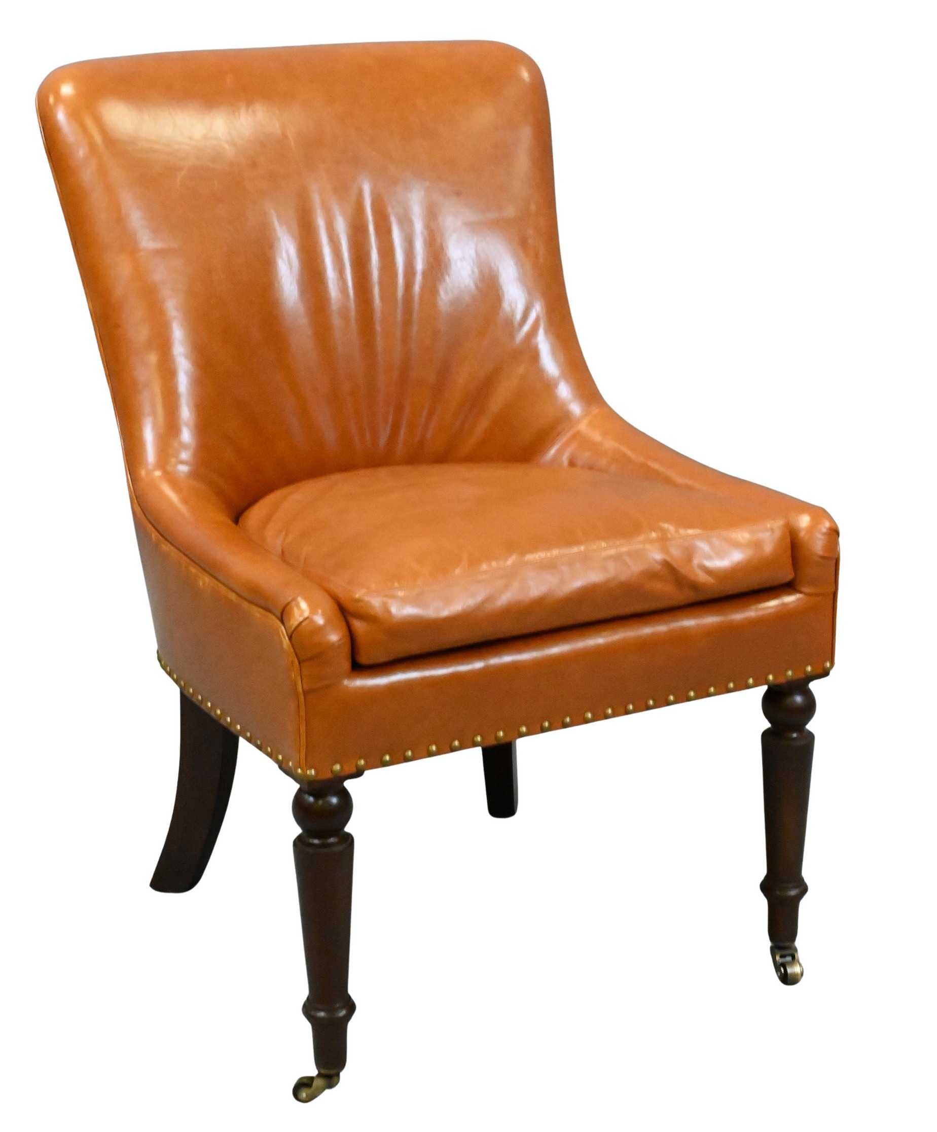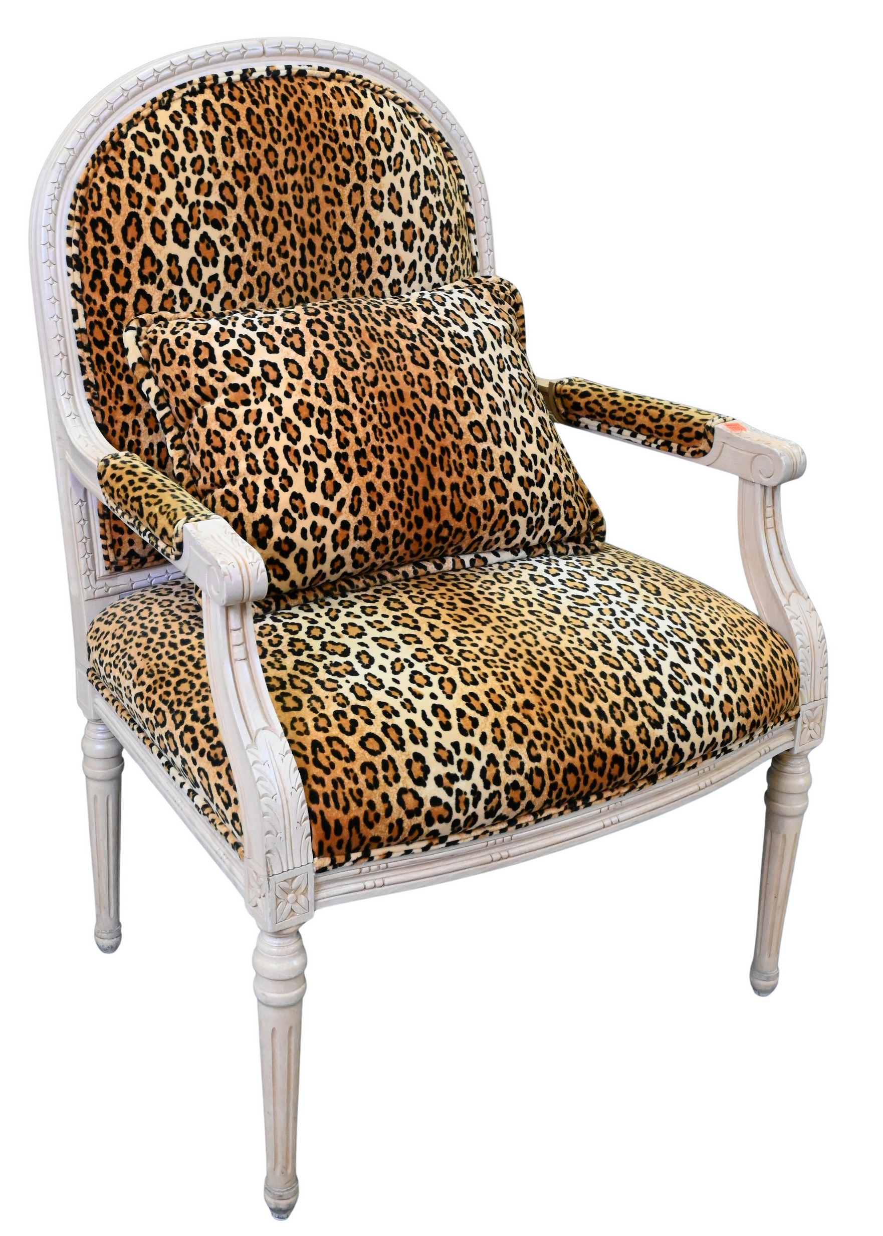 in custom leopard / cheetah upholstery on carved wood body and fluted legs
