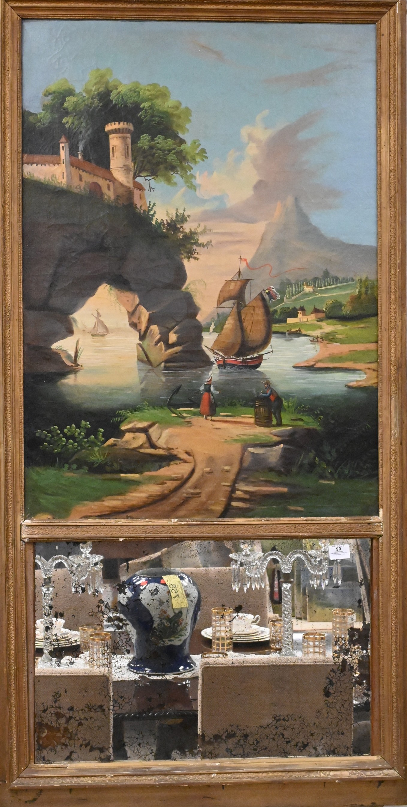 featuring an idealist Swiss landscape of two figures standing before a ship coming to harbor beneath a mountain castle